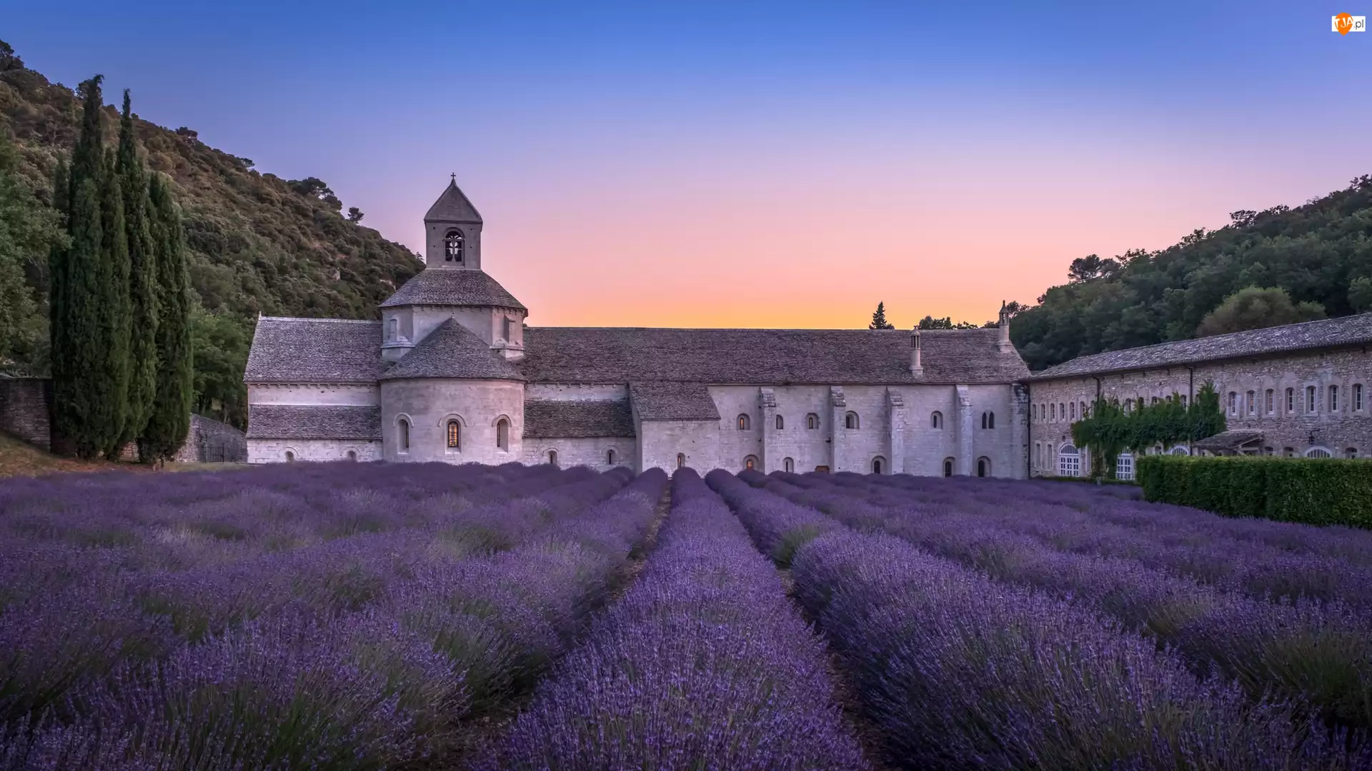 Prowansja, Francja, Lawenda, Drzewa, Pole, Klasztor
