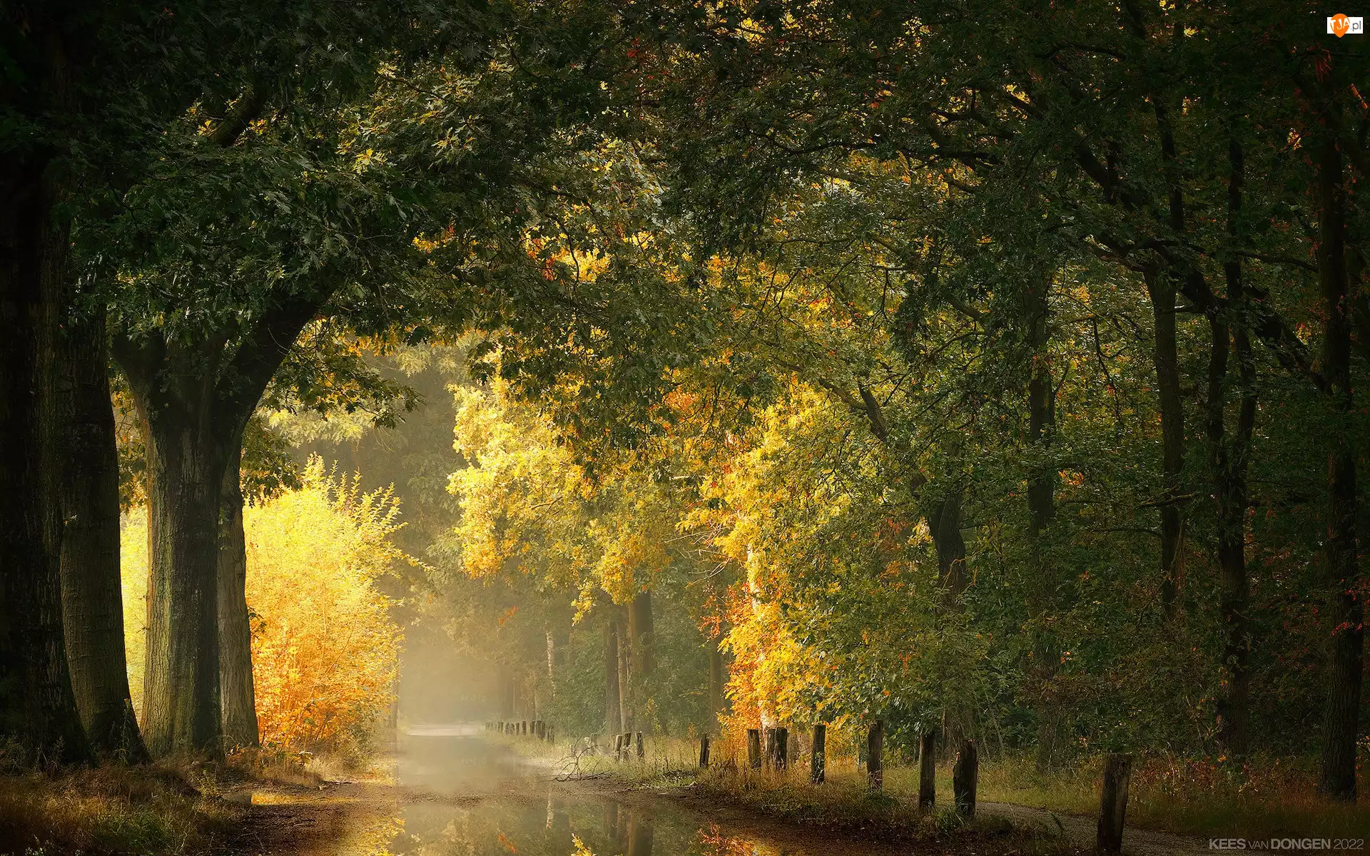 Przebijające światło, Mgła, Drzewa, Las, Jesie