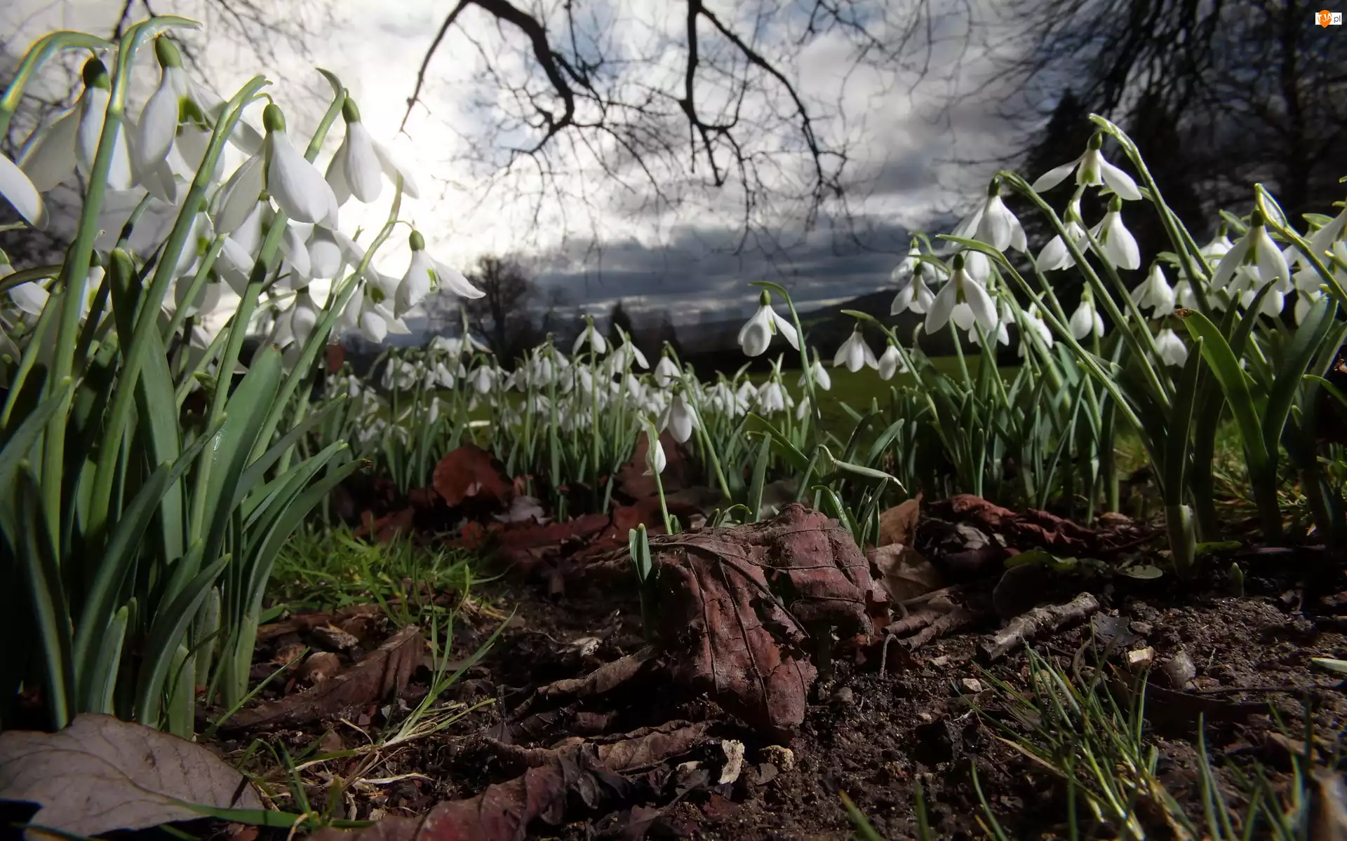 Przebiśniegi, Niebo, Liście, Gałęzie