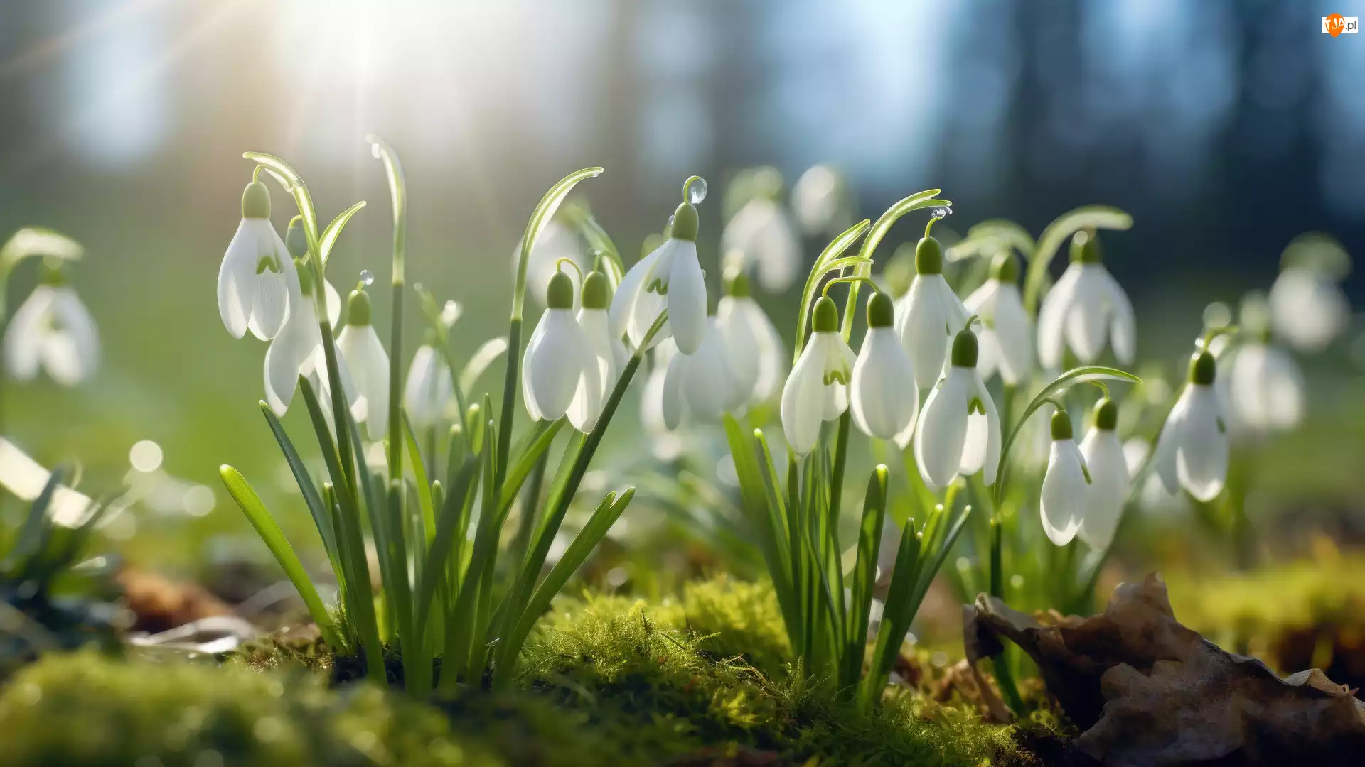Przebiśniegi, Światło, Białe, Kwiaty, Mech