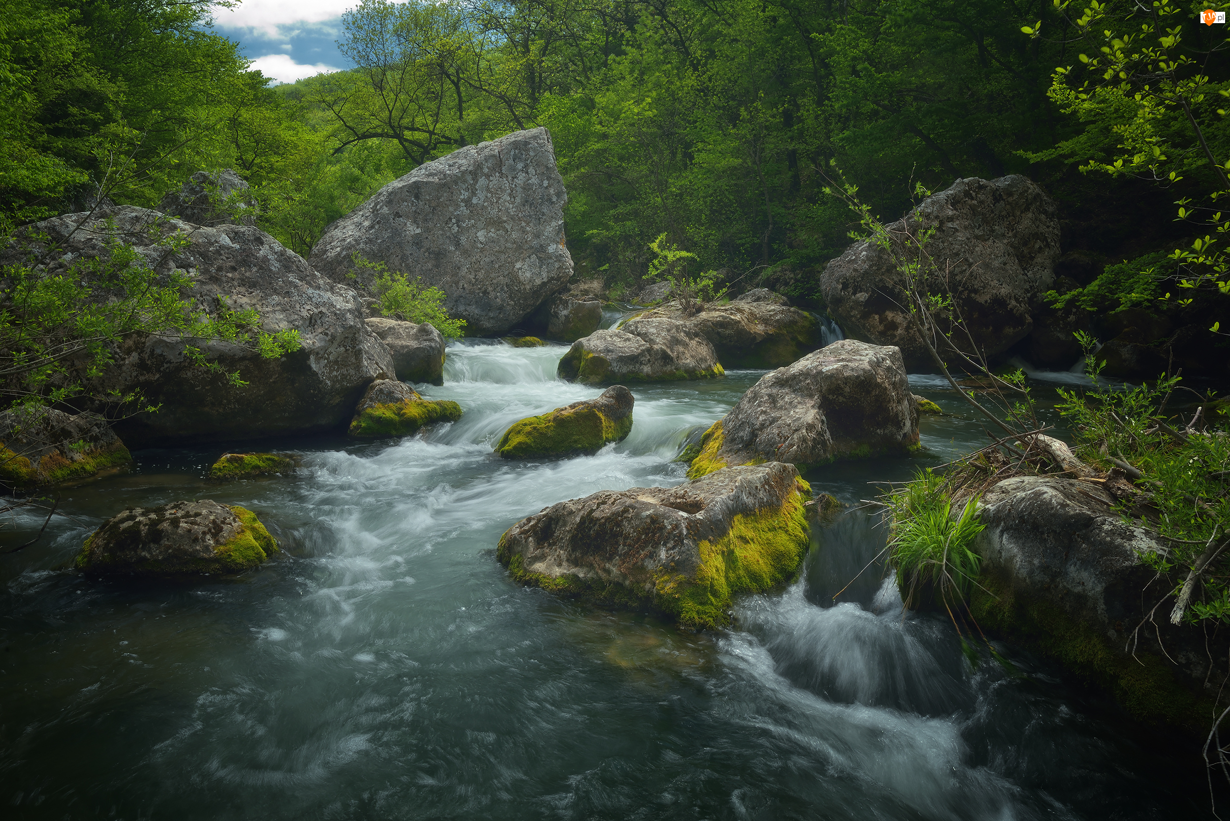 Kamienie, Rzeka Czorna, Drzewa, Krym, Mech, Dolina Bajdarska