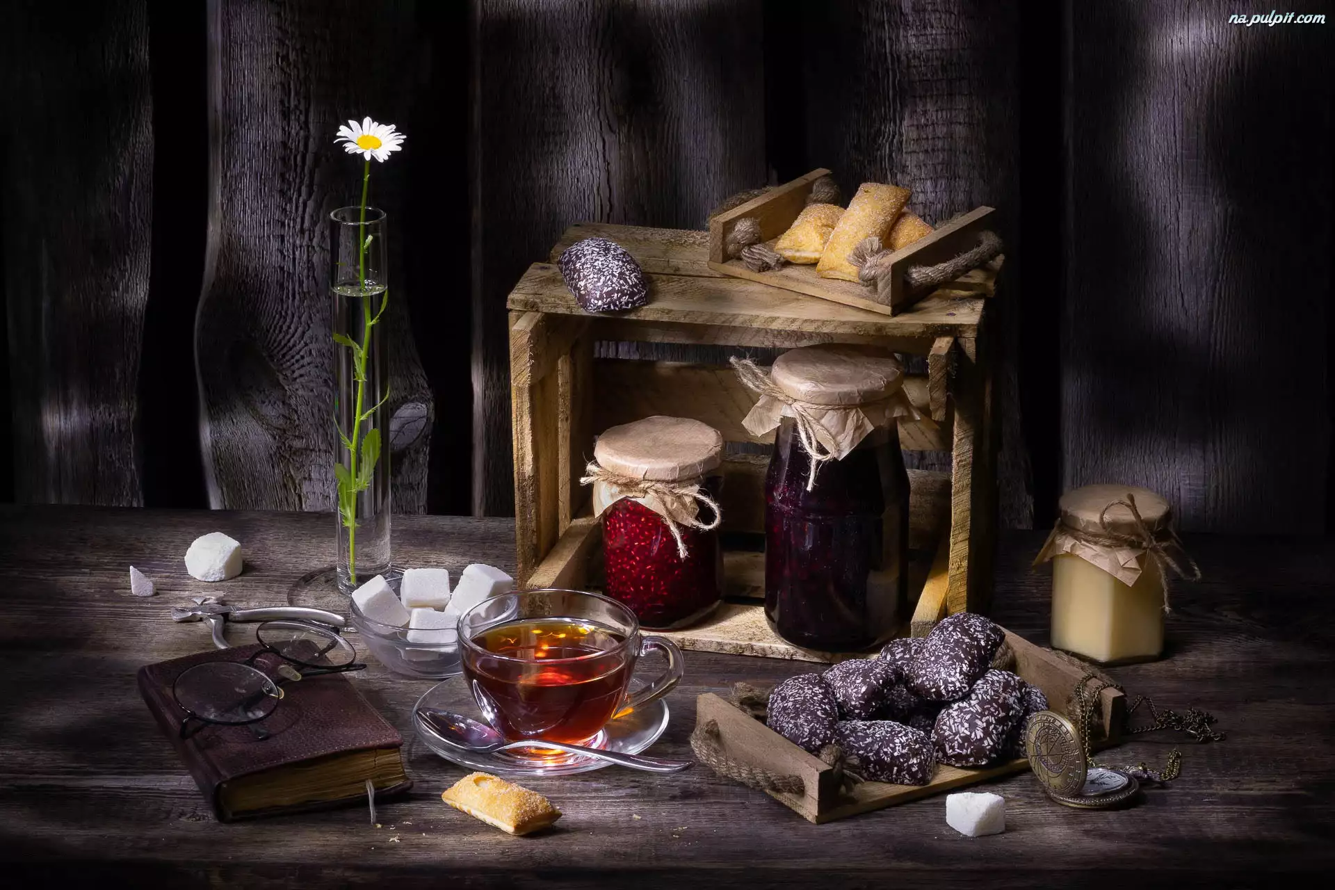 Okulary, Zegarek, Wazon, Ciastka, Ciemne tło, Filiżanka, Przetwory, Cukier, Kwiat, Słoiki, Herbata, Skrzynka, Miód, Książka, Deski