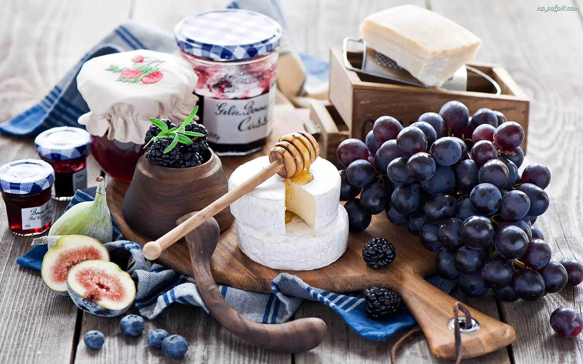 Winogrona, Jeżyny, Ściereczka, Ser, Deska, Dżem, Figi