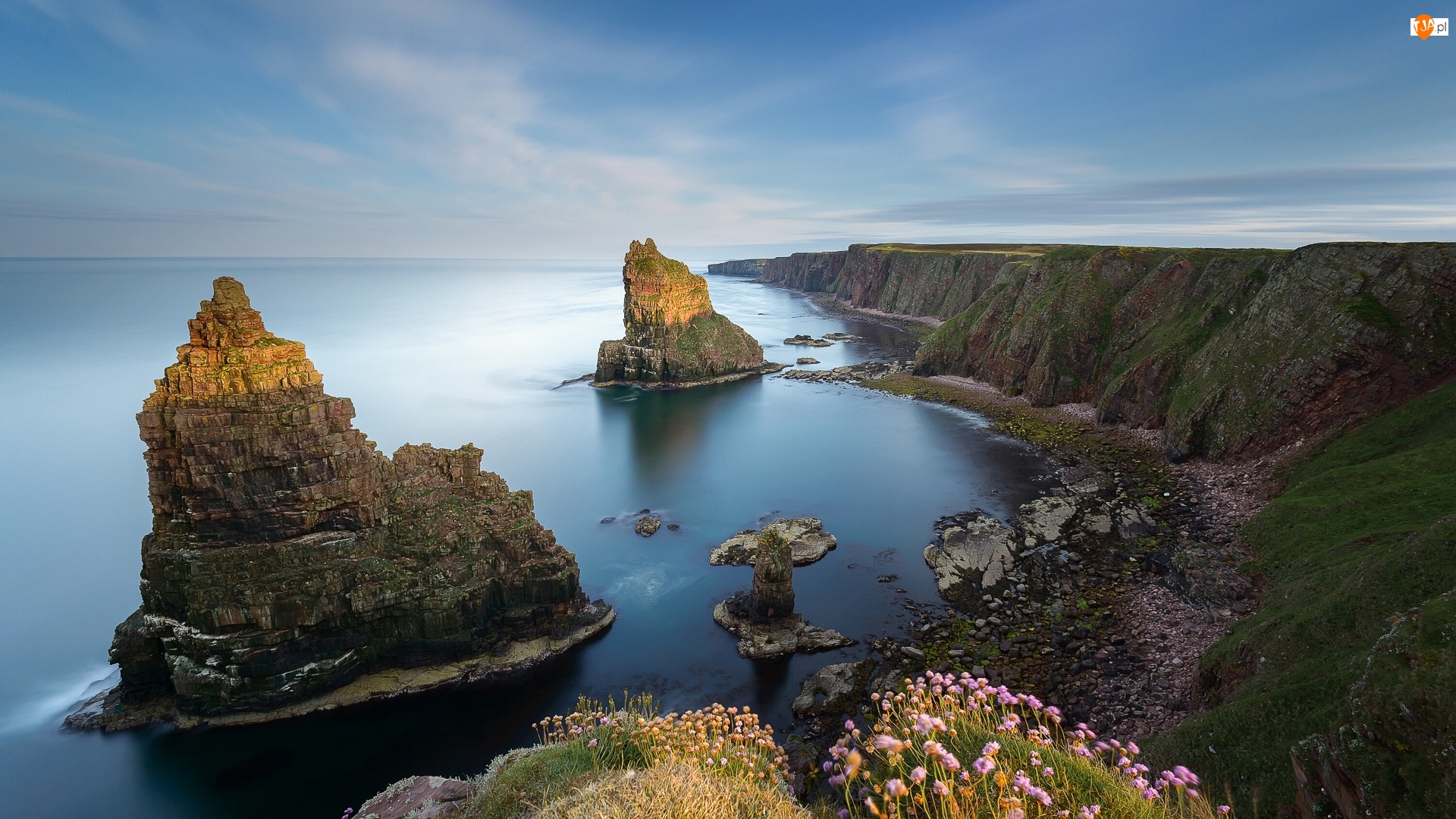 Duncansby Stacks, Przylądek Duncansby Head, Wybrzeże, Roślinność, Morze, Skały, Szkocja, Klif