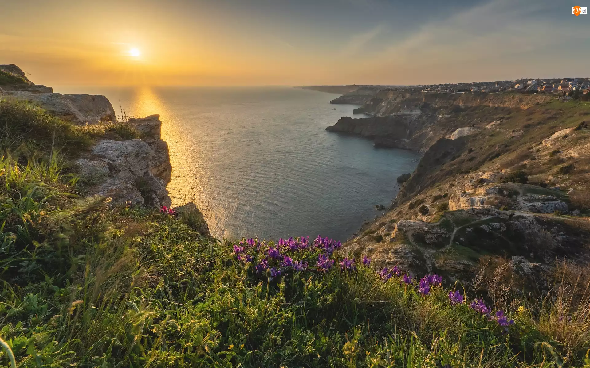 Skały, Krym, Morze Czarne, Roślinność, Przylądek, Wybrzeże, Zachód słońca, Kap Fiolent