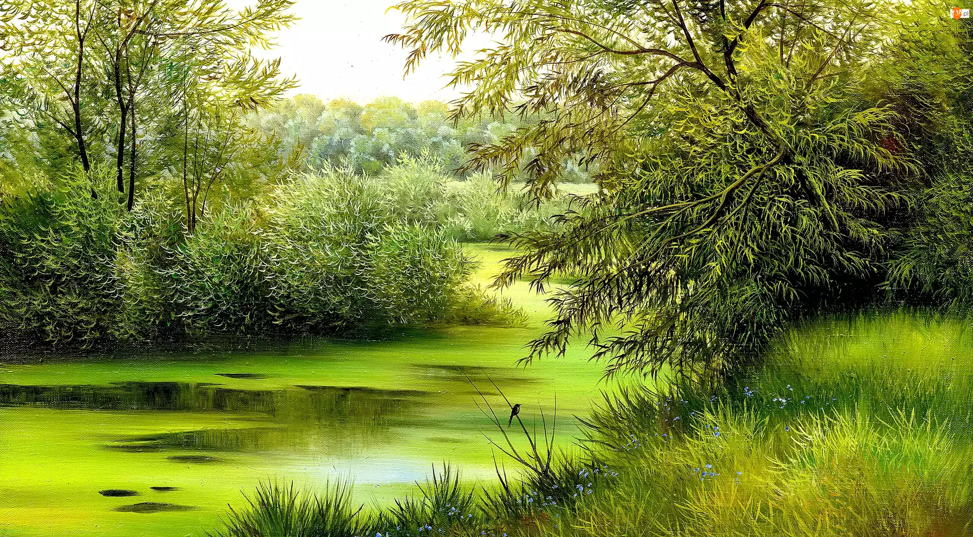 Przyroda, Drzewa, Malarstwo, Ptak, Obraz, Staw