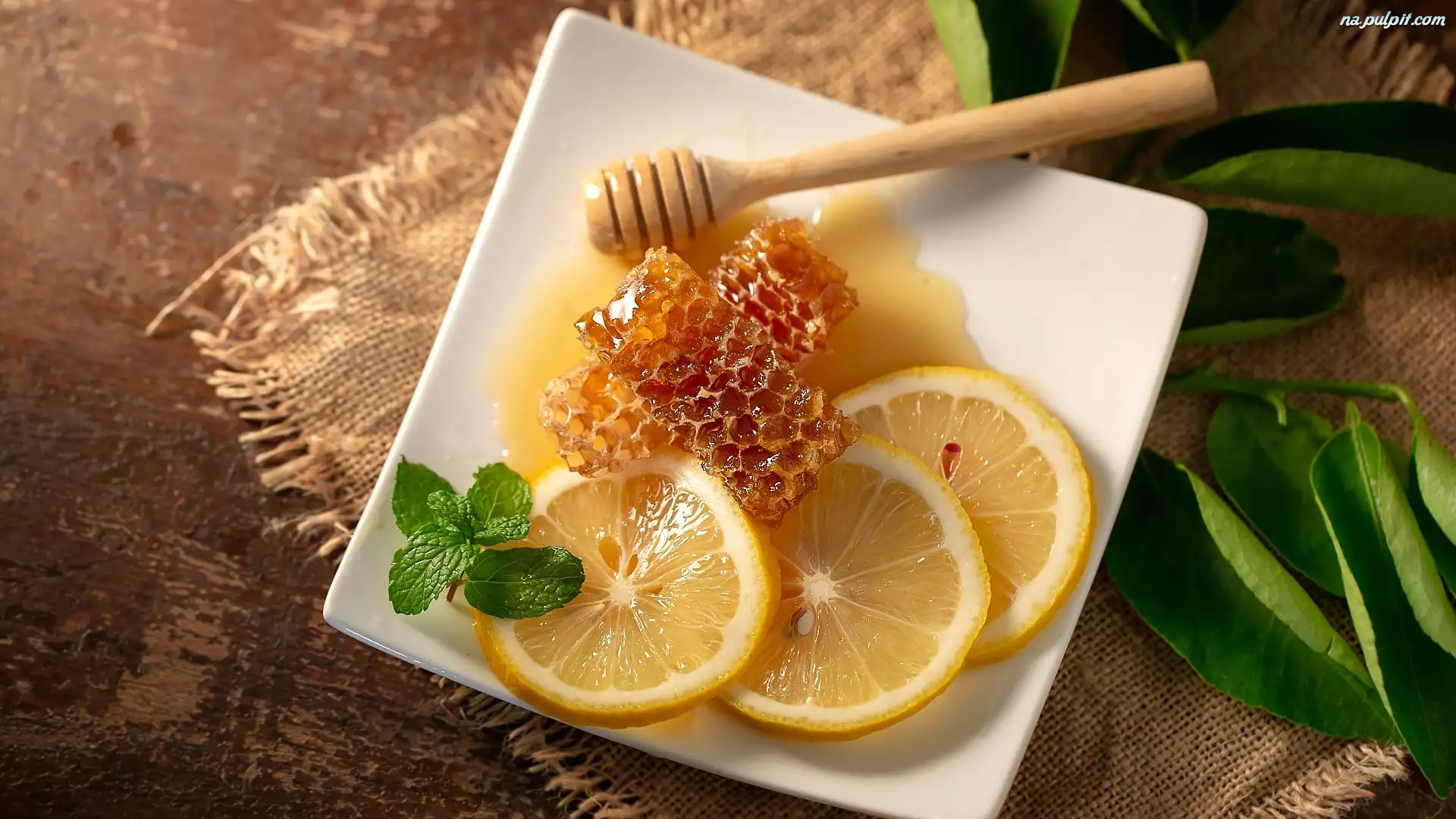 Cytryna, Plastry pszczele, Mięta, Talerz, Plastry, Miód