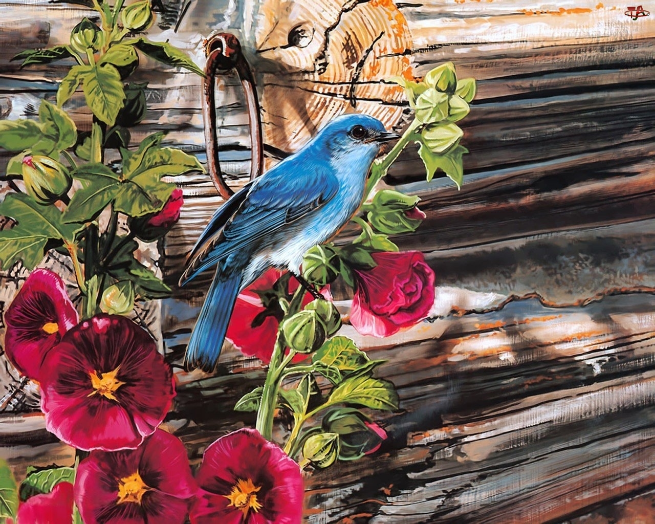 Malwy, Ptak, Kwiaty, Czerwone, Niebieski