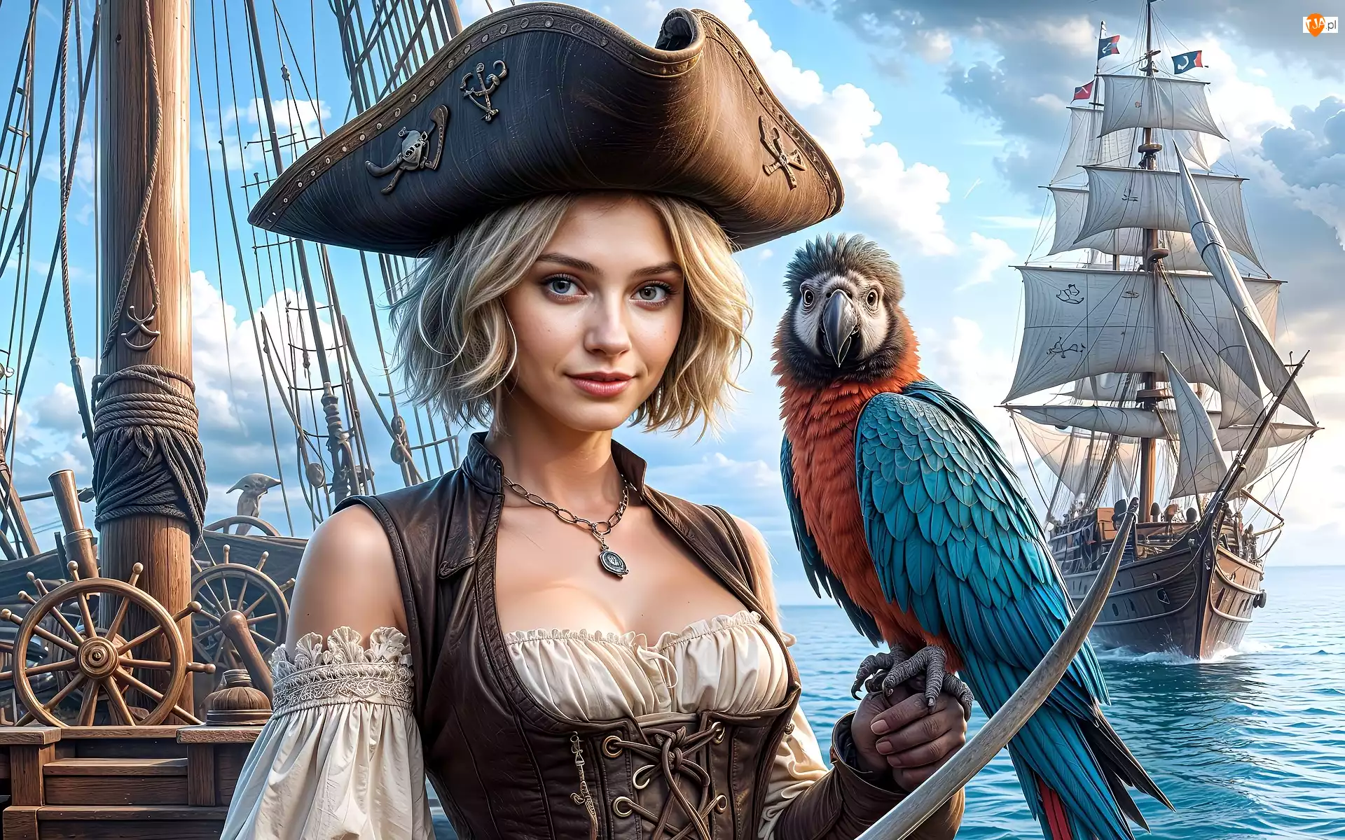 Ptak, Kobieta, Morze, Papuga, Pirat, Żaglowce, Ar