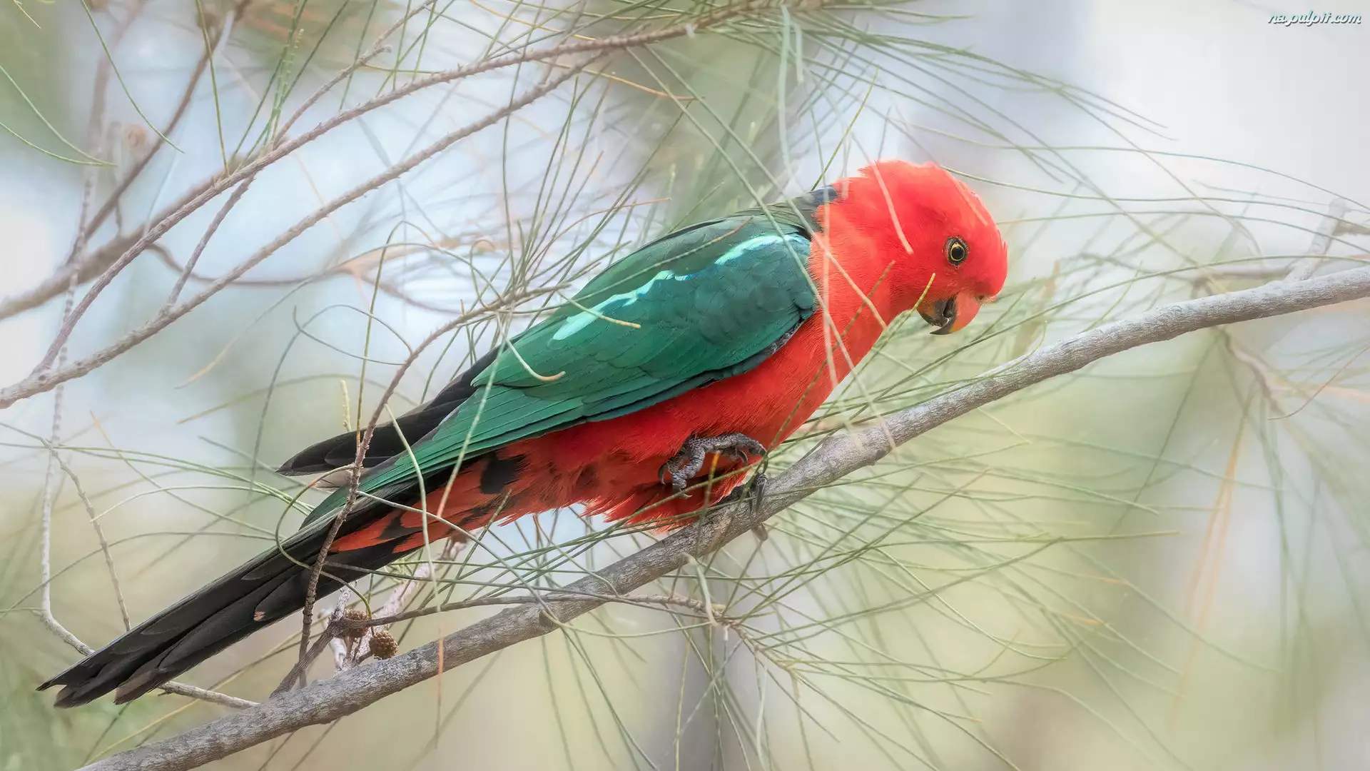 Ptak, Sosna, Papuga, Zielono-czerwona, Gałązki
