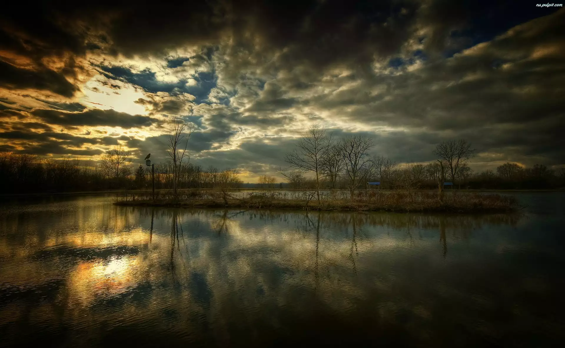 Ptak, Zmierzch, Chmury, Jezioro, Drzewa