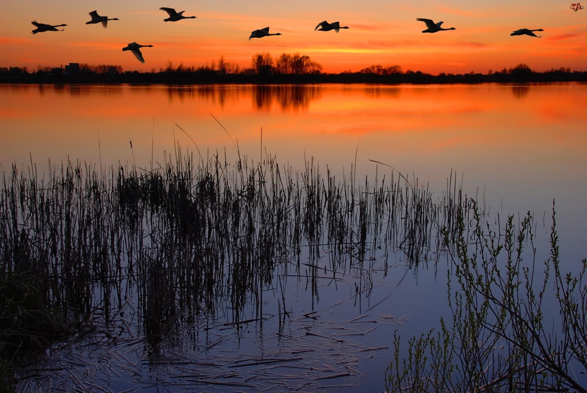 Ptaki, Jezioro, Słońca, Zachód, Lecące