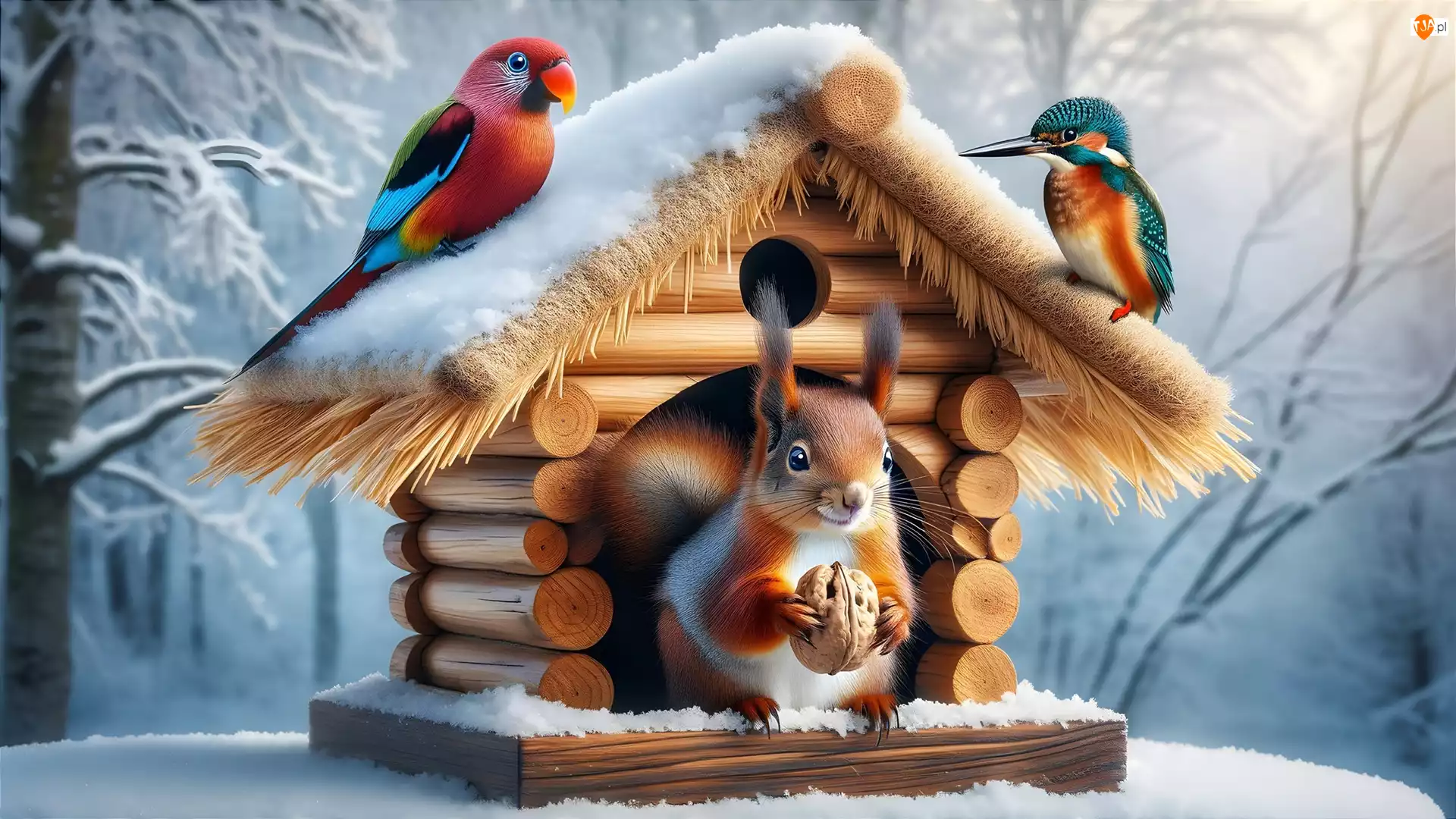 Ptaki, Papuga, Grafika, Wiewiórka, Zima, Karmnik, Zimorodek