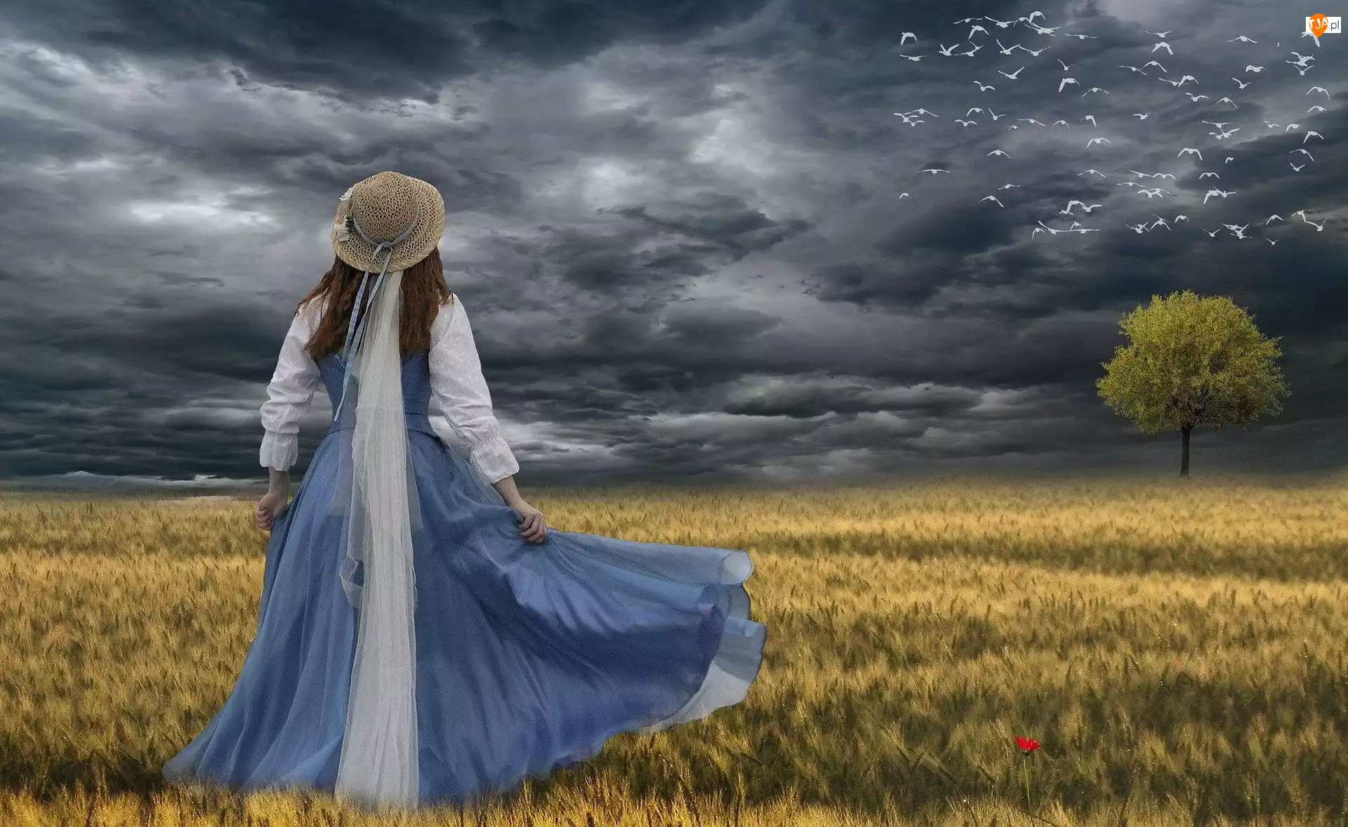 Ptaki, Pochmurne, Zboża, Niebo, Kobieta