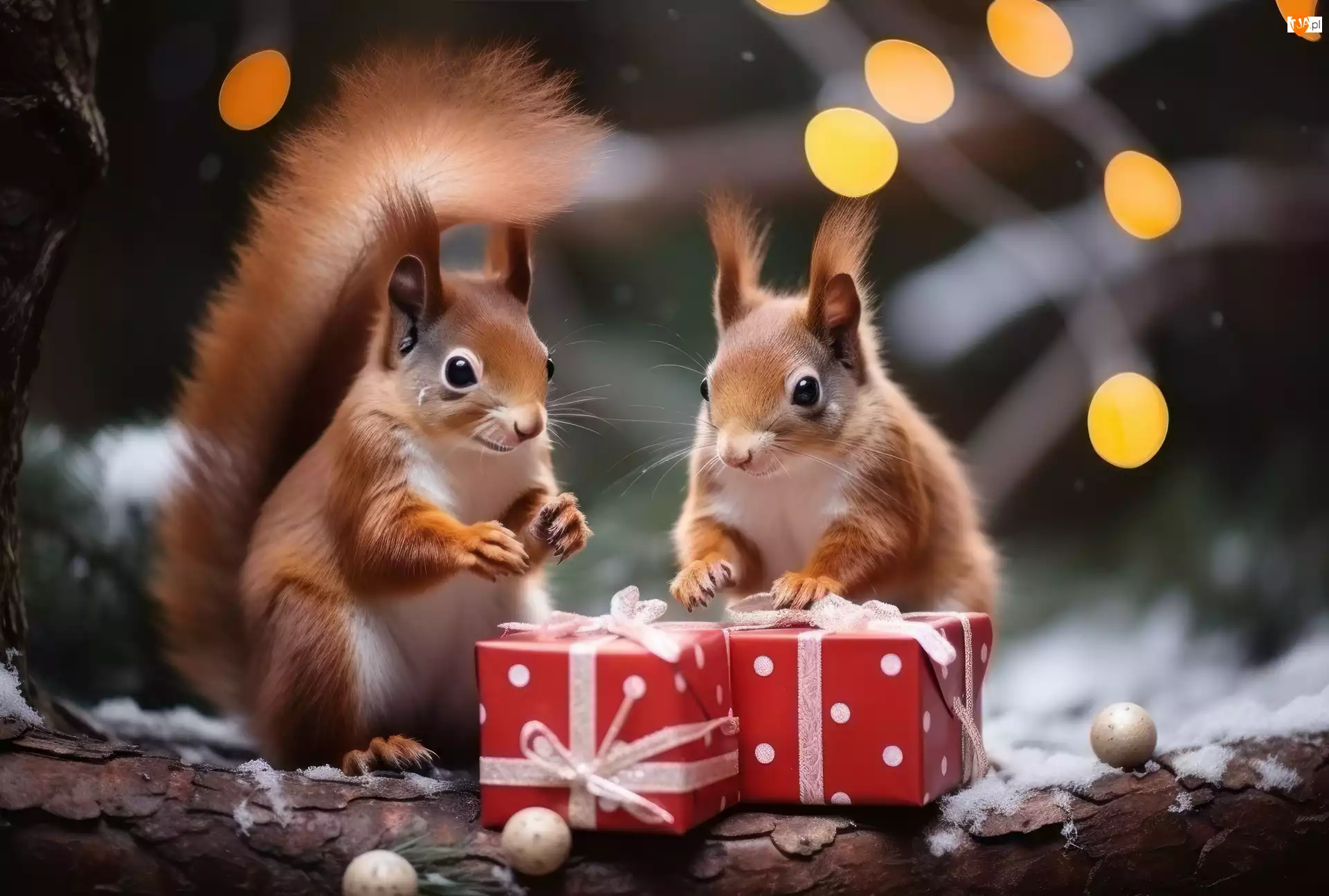 Pudełka z prezentami i dwie wiewiórki