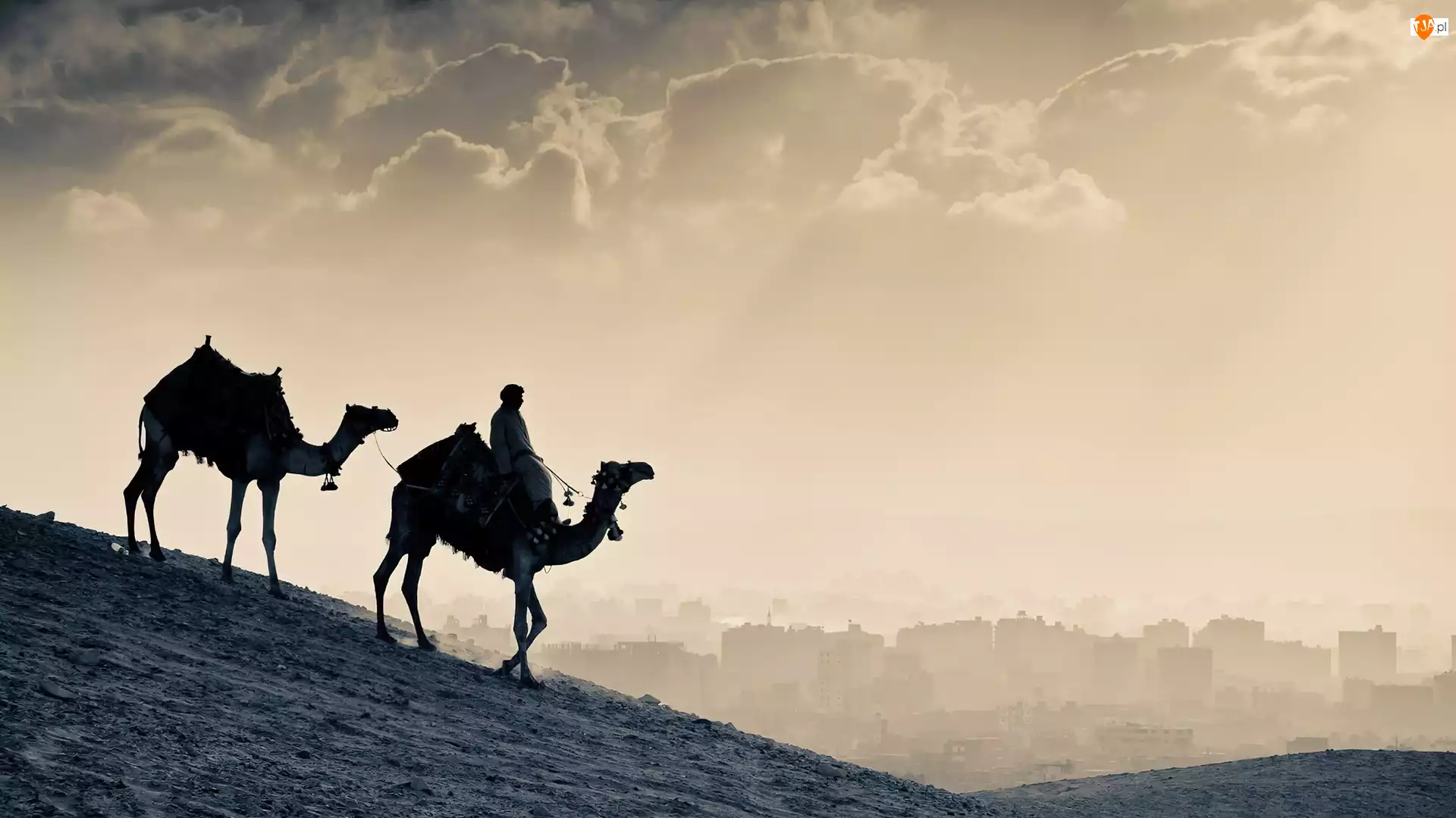 Pustynia, Wielbłądy, Miasto, Piasek, Człowiek