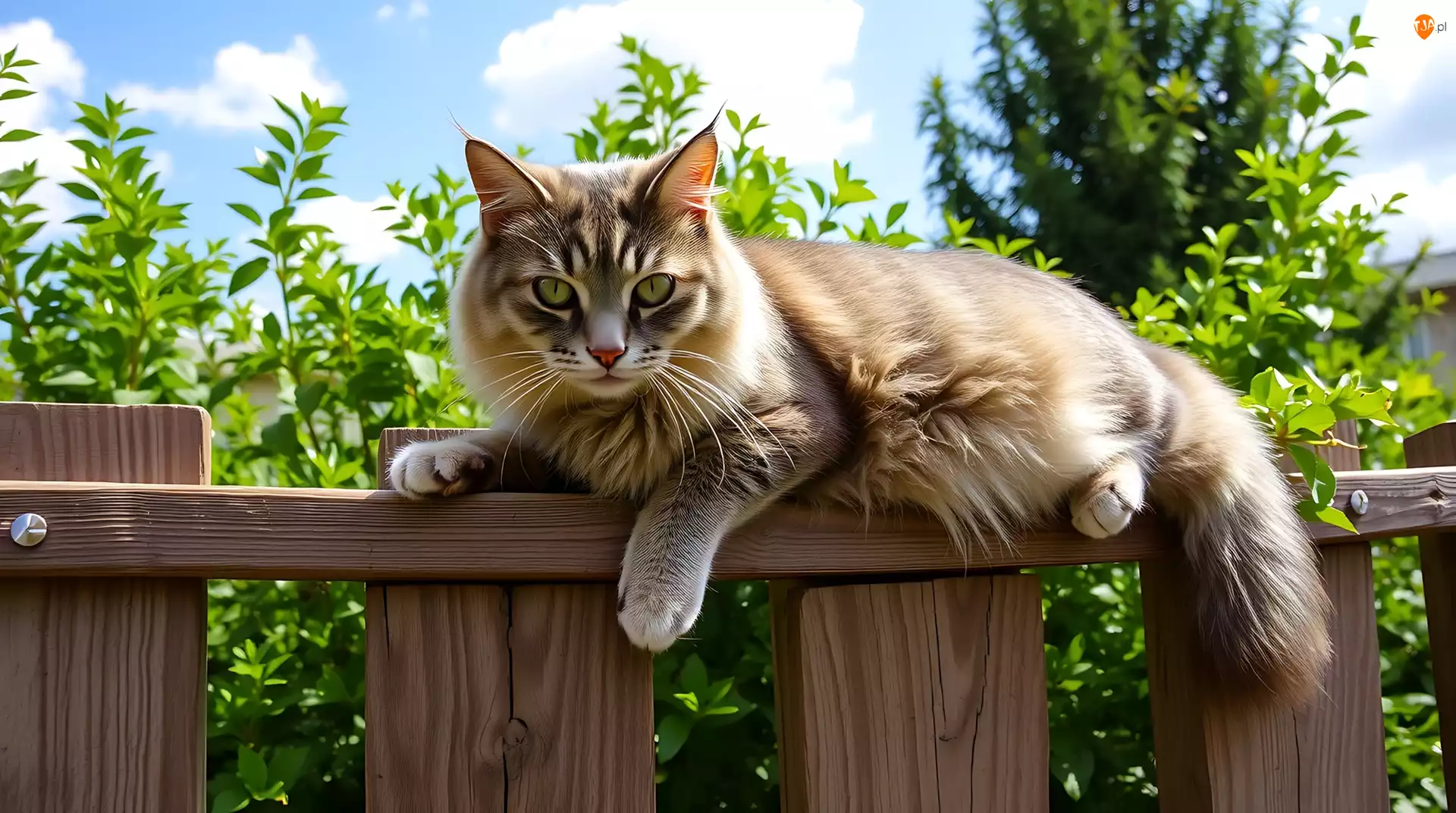 Puszysty, Kot, Zieleń, Grafika AI, Płot, Niebo