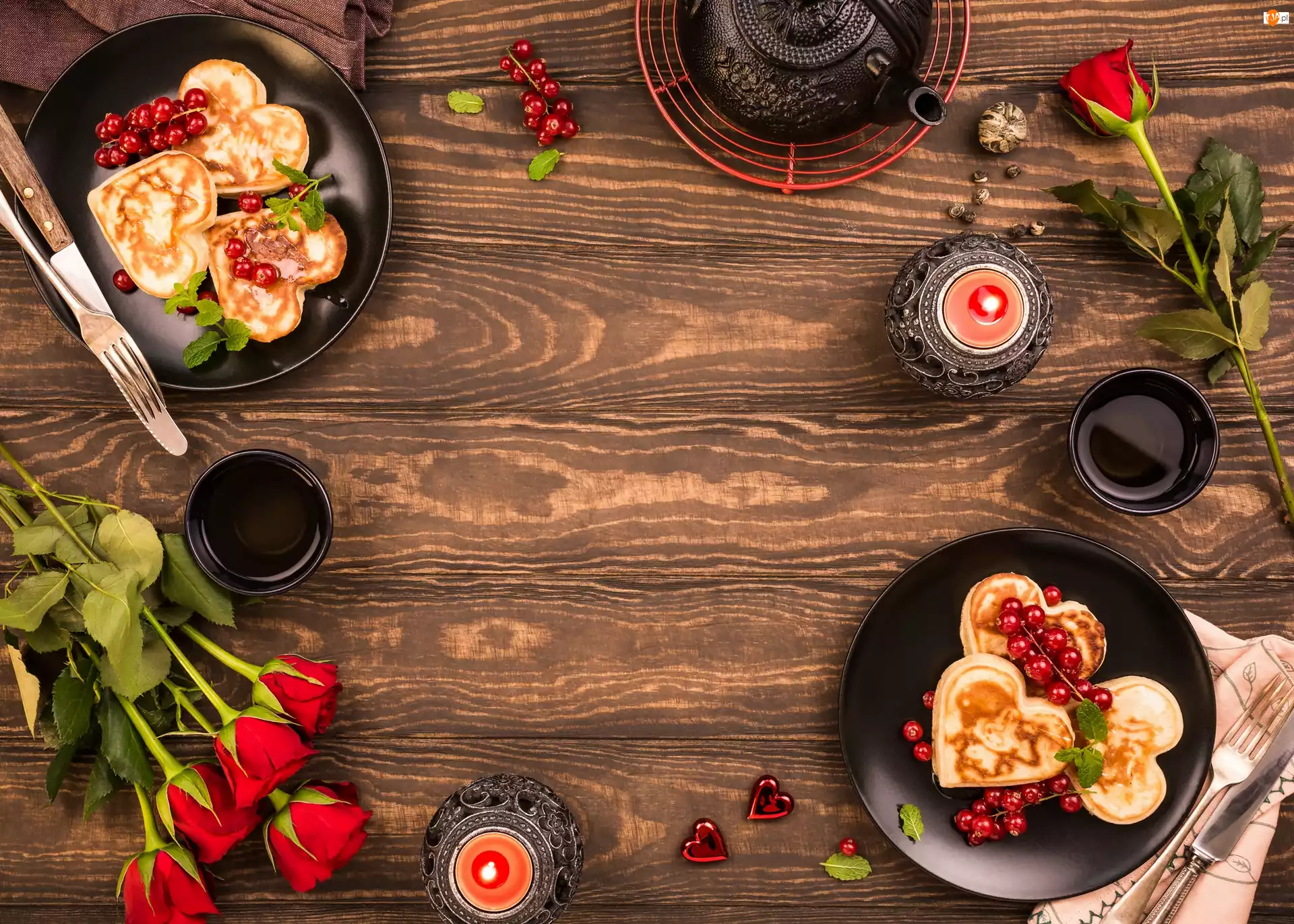 Kubki, Herbata, Naleśniki, Świeczki, Róże, Talerze