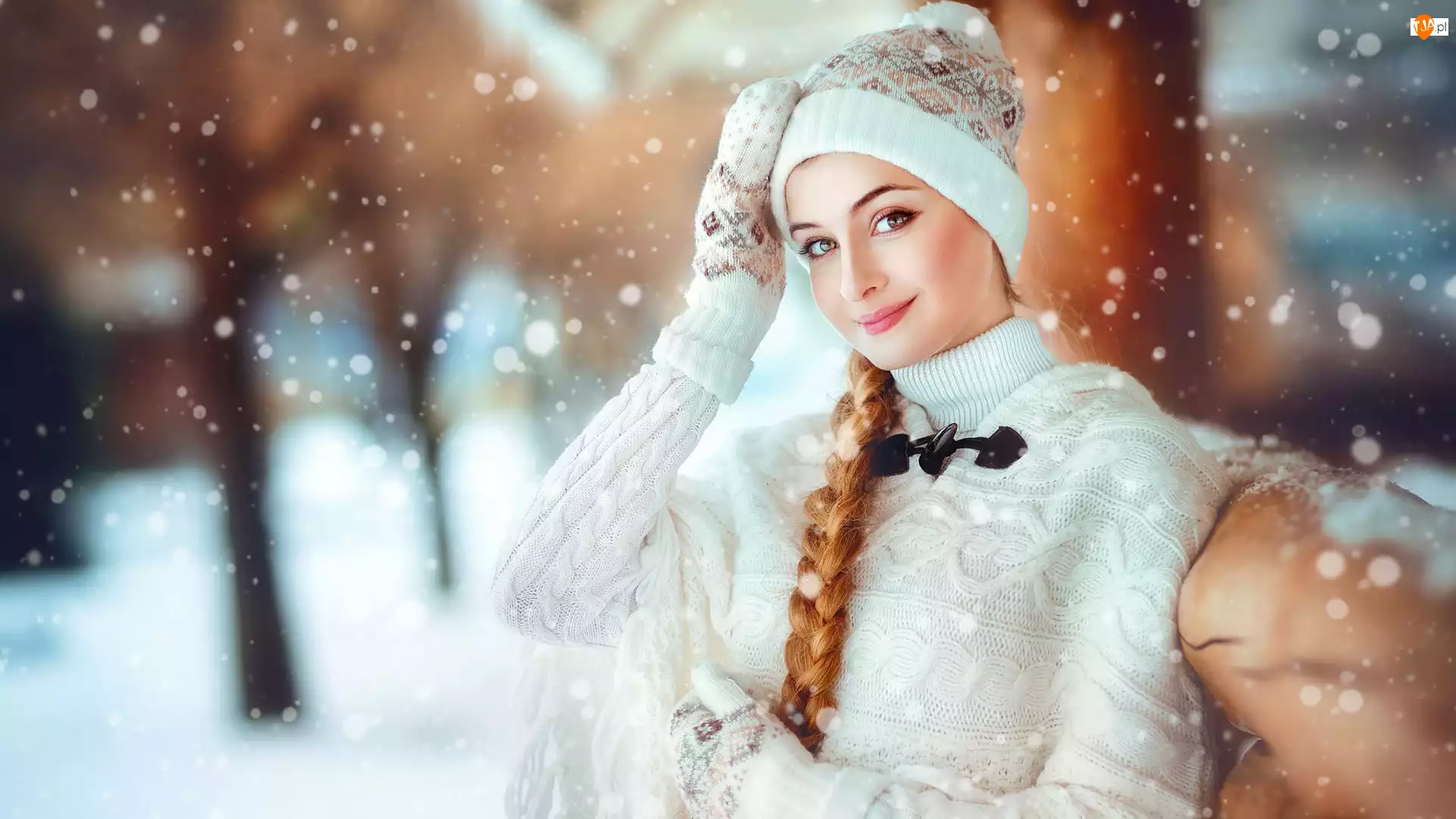 Rękawice, Śnieg, Czapka, Kobieta, Warkocz