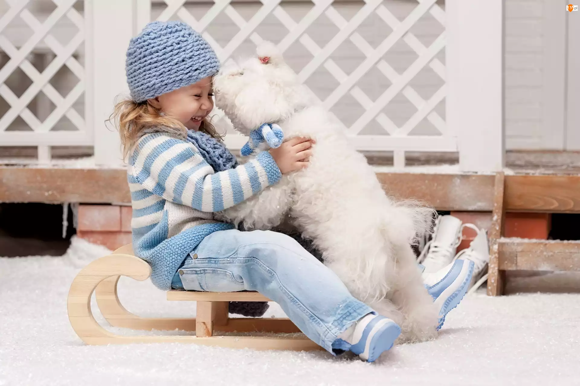 Dziewczynka, Pudel miniaturowy, Radość, Sanki
