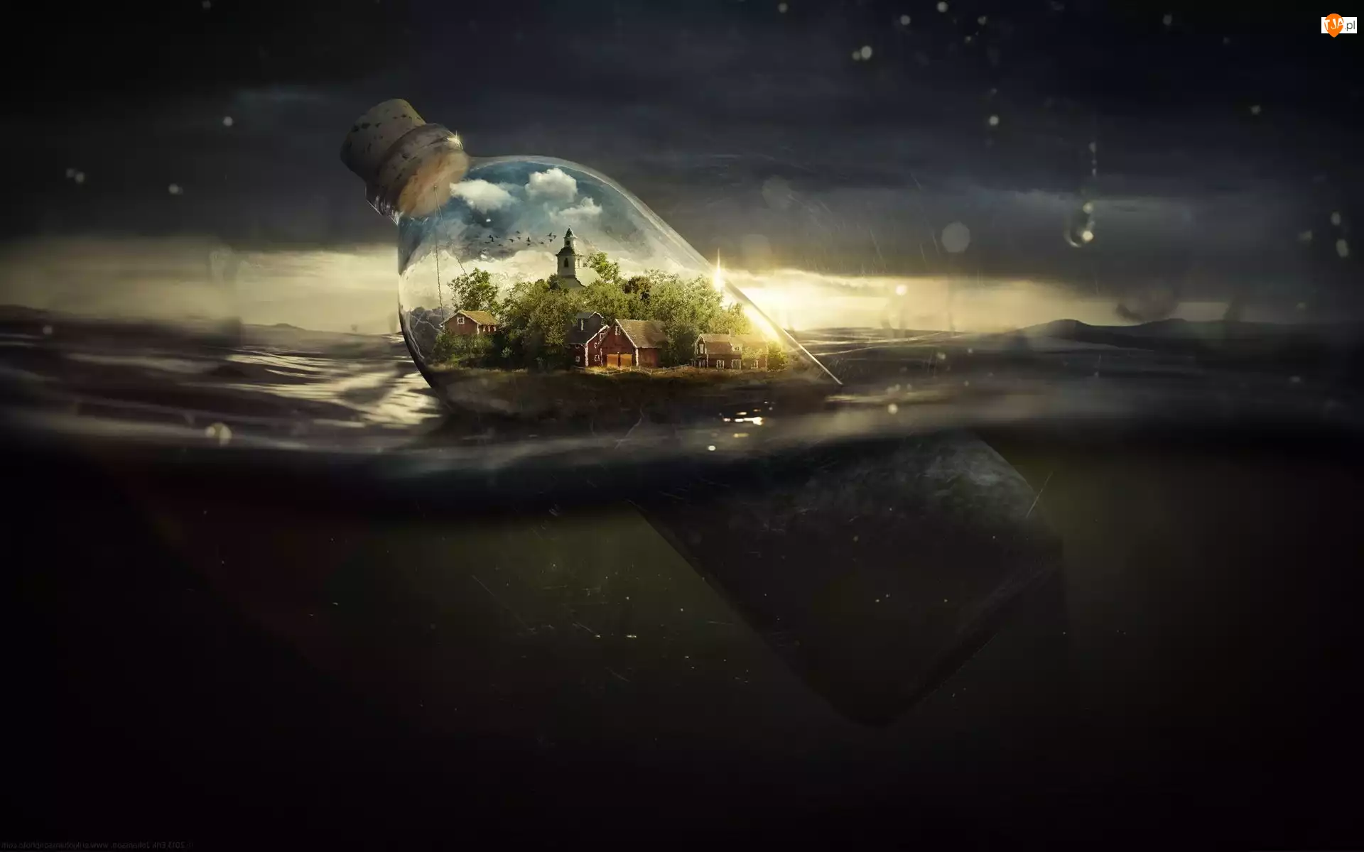 Rafandynka, Świat, Niebo, Chmury, Fantasy, Ocean, Butelka