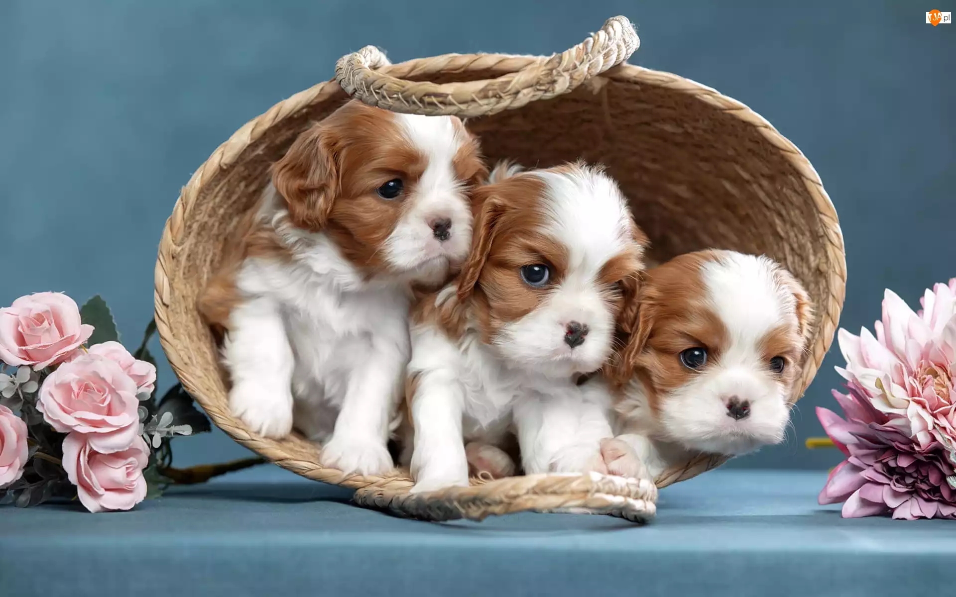 Kwiaty, Psy, Koszyk, Róże, Trzy, Cavalier king charles spaniel, Chryzantemy, Szczenięta