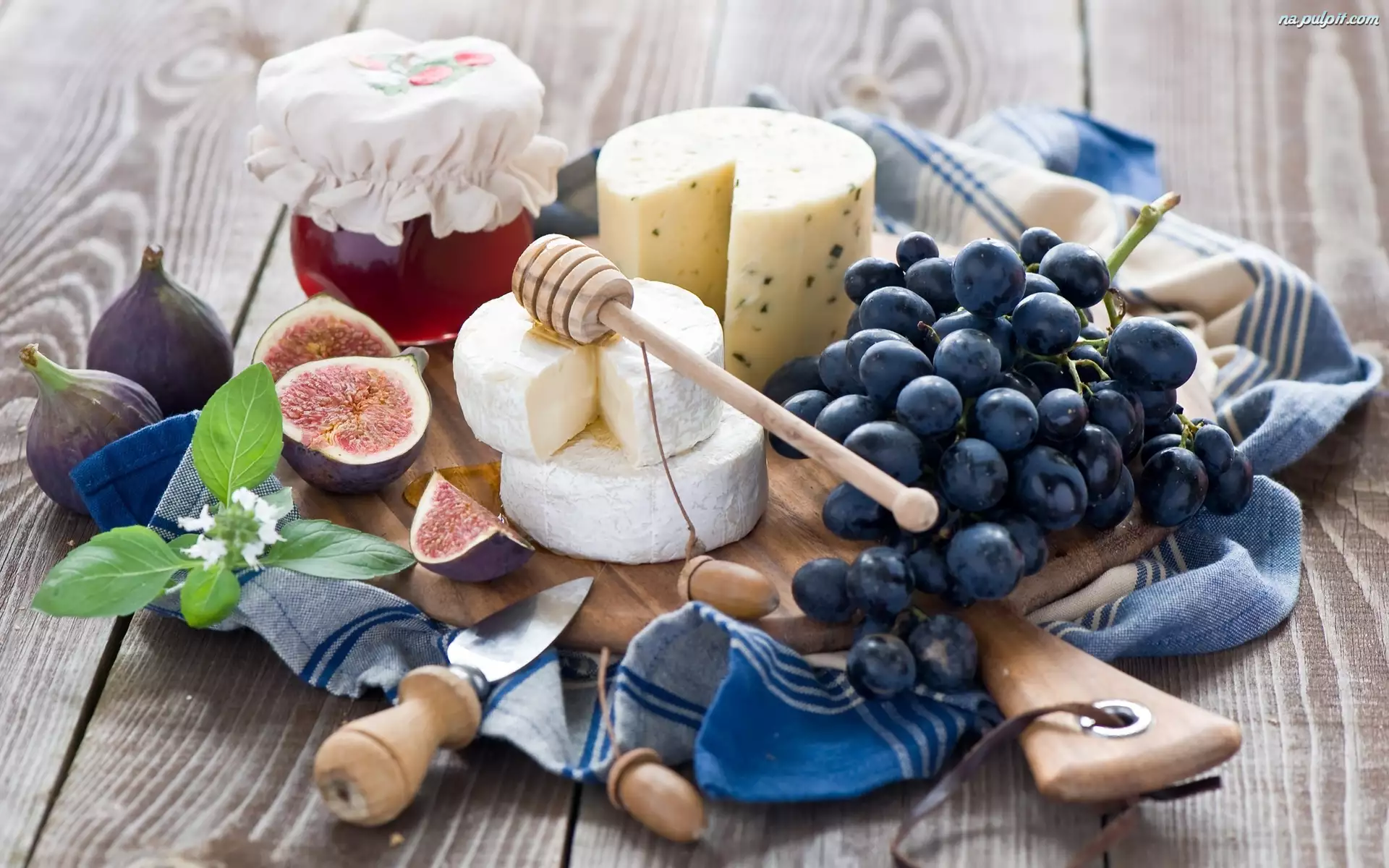Winogrono, Miód, Nóż, Sery, Ręcznik, Deska, Granat