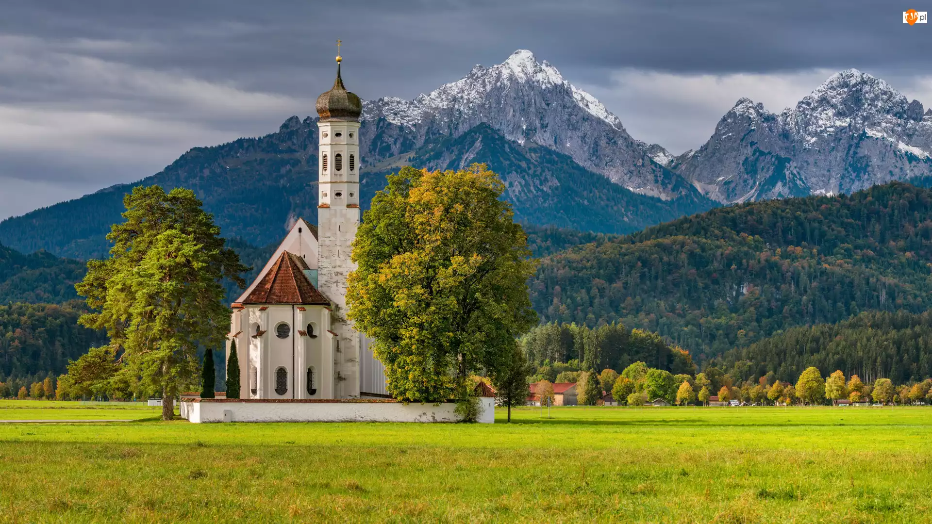 Region Allgau, Góry, Eglise Saint Coloman, Bawaria, Alpy, Drzewa, Niemcy, Kościół