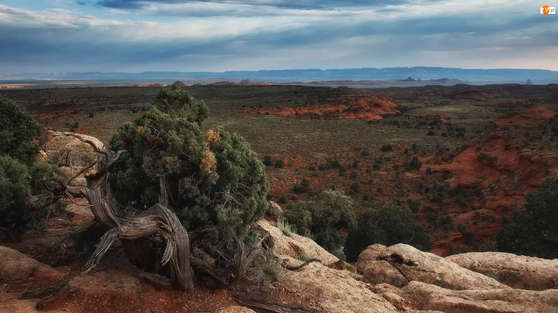 Region Monument Valley, Dolina Pomników, Stany Zjednoczone, Wyżyna Kolorado, Stan Arizona, Skały, Rośliny