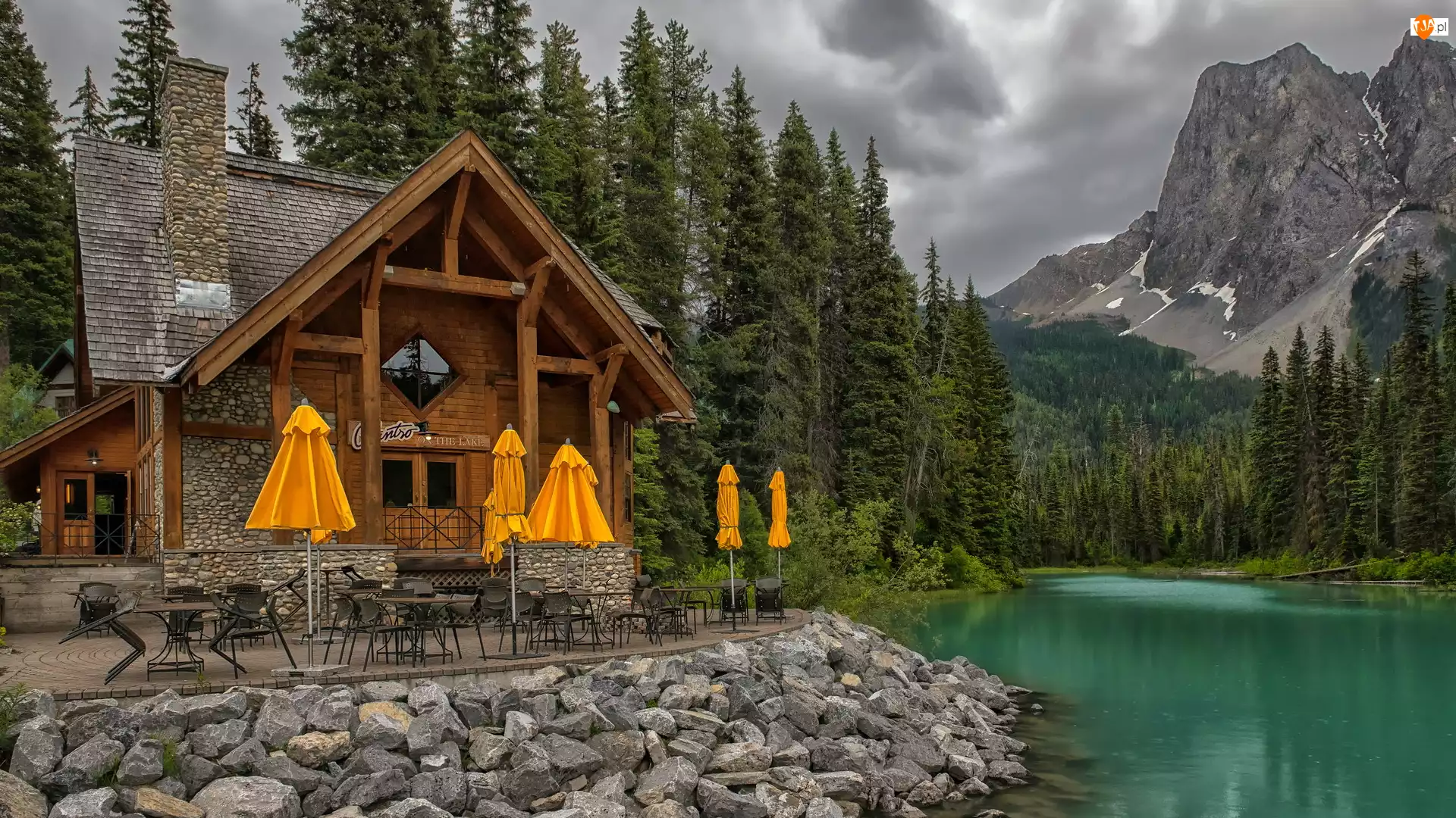 Kanada, Góry, Park Narodowy Yoho, Emerald Lake, Cilantro on the Lake, Restauracja, Parasole, Dom, Jezioro, Kolumbia Brytyjska