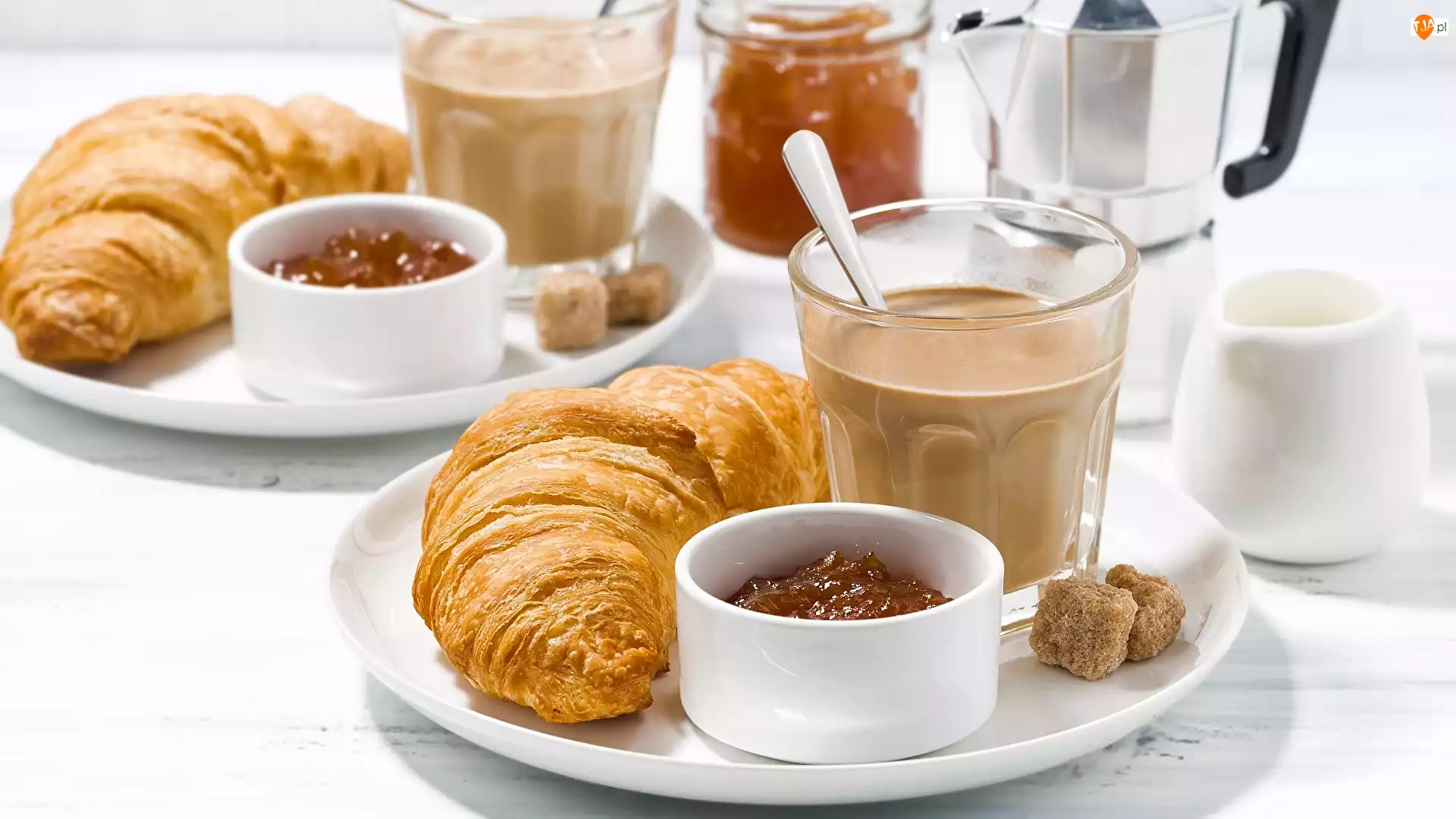 Rogaliki, Croissanty, Kostki cukru, Śniadanie, Talerz, Kawa, Dżem