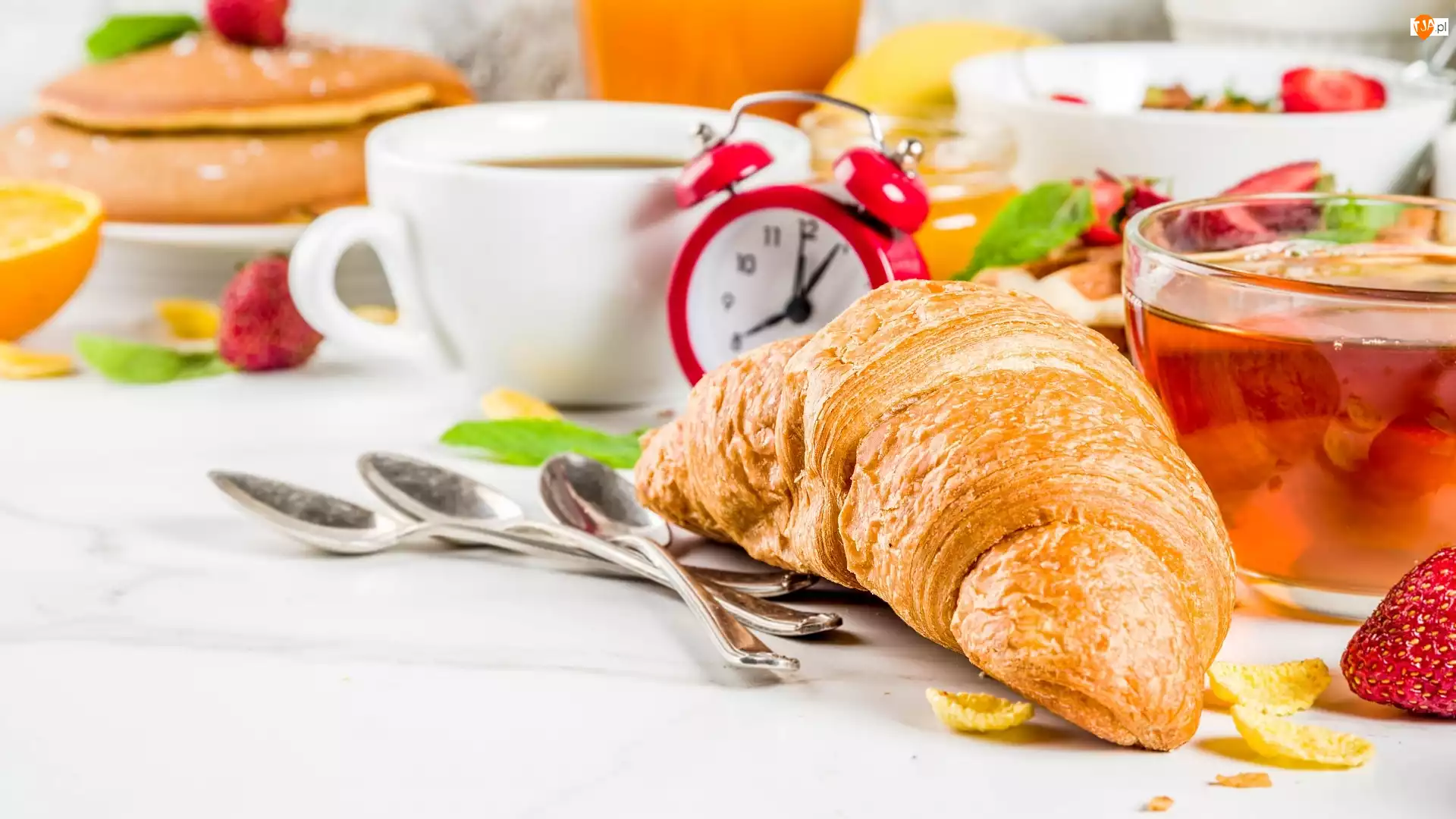 Rogalik, Croissant, Budzik, Śniadanie, Herbata, Kawa, Sok