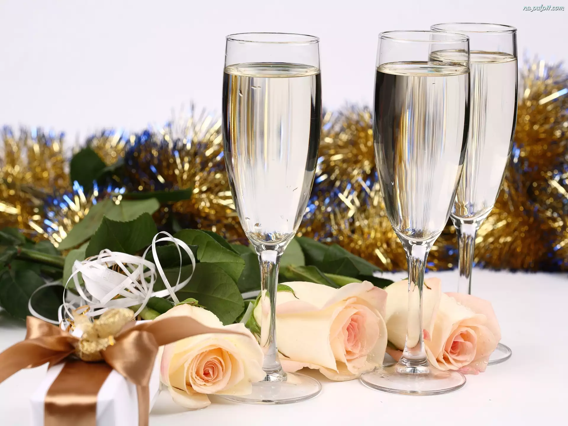 Rok, Róże, Szampan, Kieliszki, Nowy