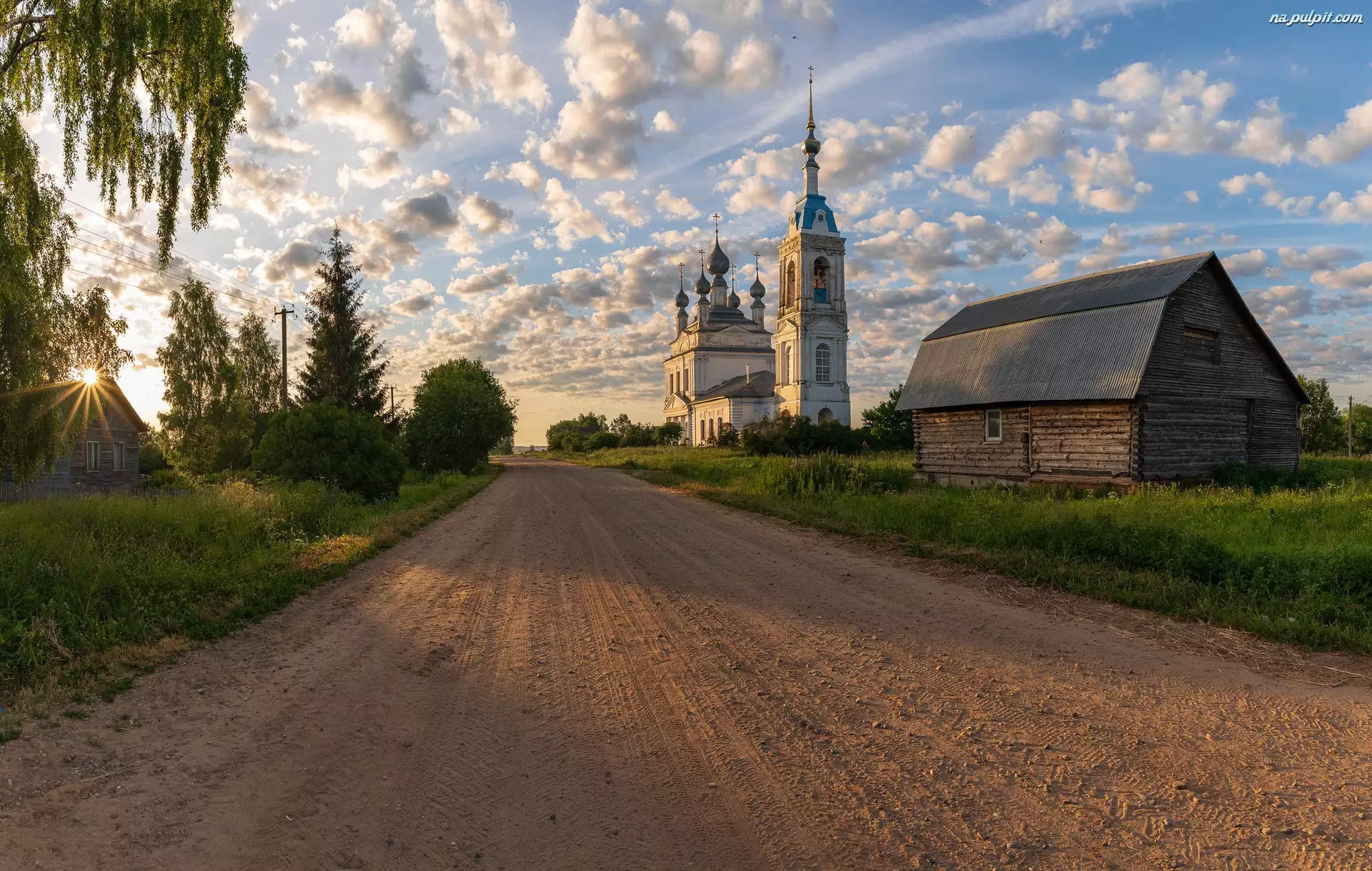 Rosja, Drewniane, Obwód jarosławski, Cerkiew, Savinskoye, Domy, Chmury, Droga, Wschód słońca
