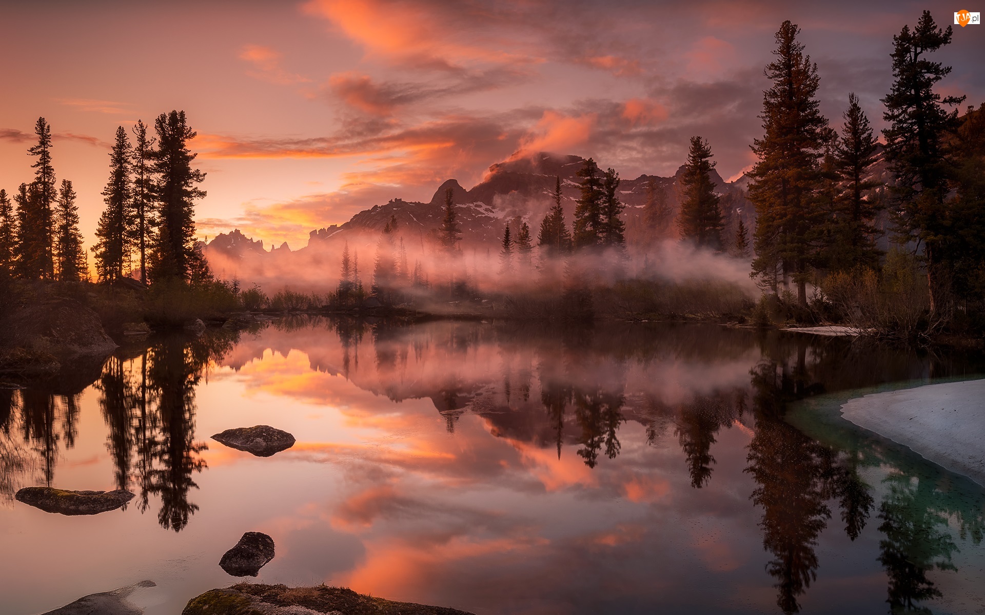 Rosja, Drzewa, Syberia, Zachód słońca, Park przyrody Ergaki, Mgła, Góry Ergaki, Jezioro Lazurnoye, Pasmo Western Sayan