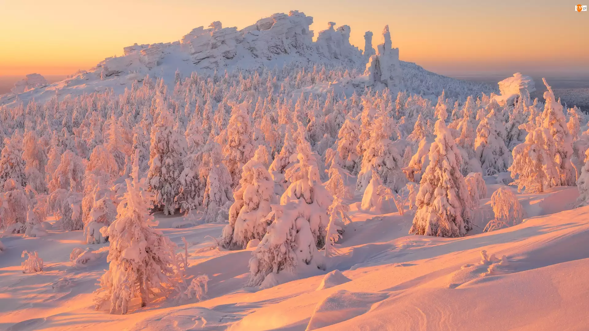 Rosja, Drzewa, Ural, Wschód słońca, Góry, Świerki, Ośnieżone, Zima, Zaspy