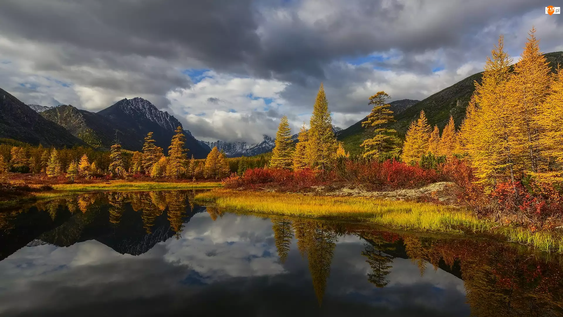 Rosja, Góry Kołymskie, Magadan, Roślinność, Kołyma, Jezioro Nevidimka, Chmury, Jesień, Drzewa