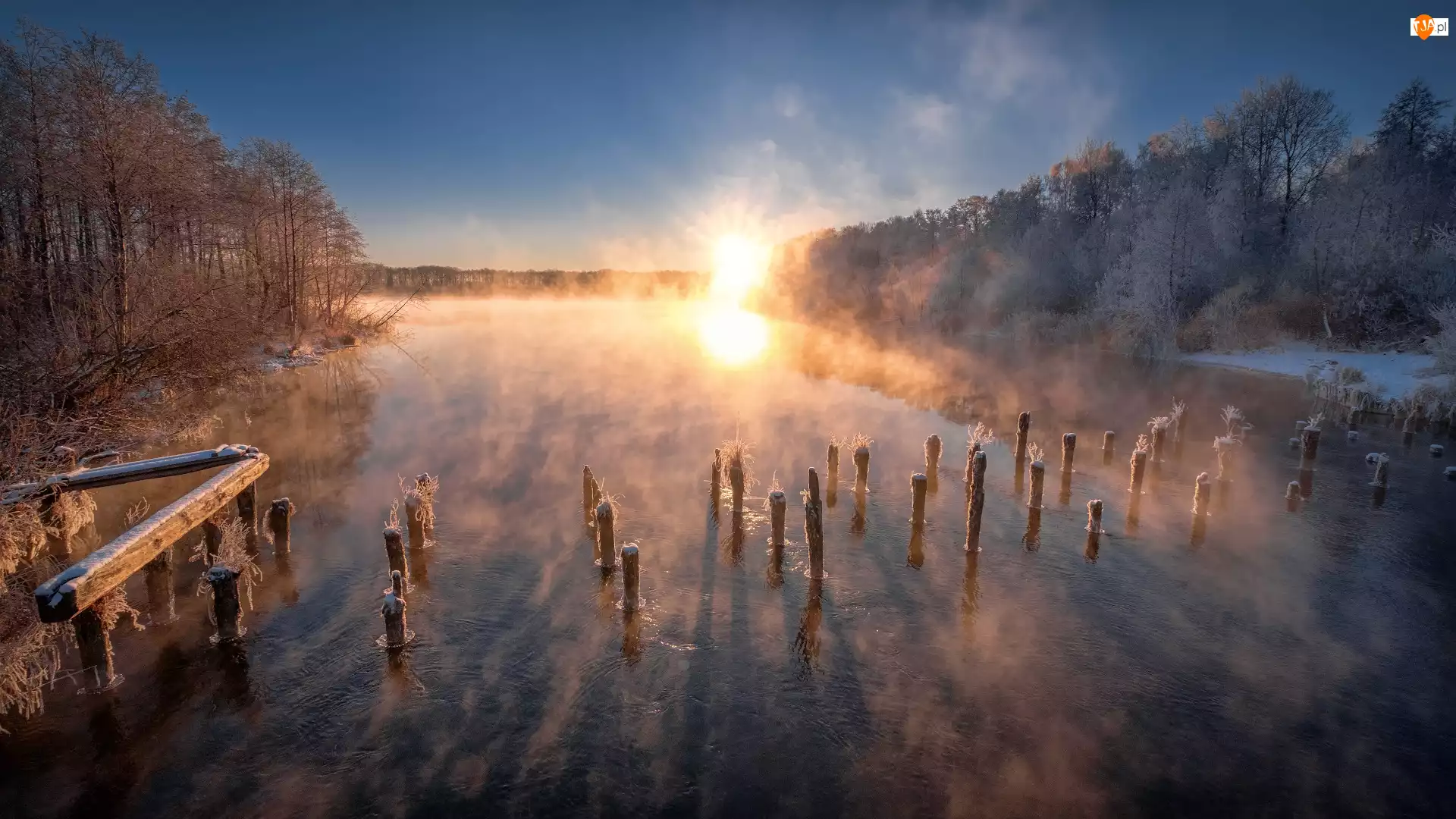 Rosja, Kołki, Szatura, Drzewa, Jezioro Białe, Zima, Wschód słońca, Mgła, Oszronione, Obwód moskiewski