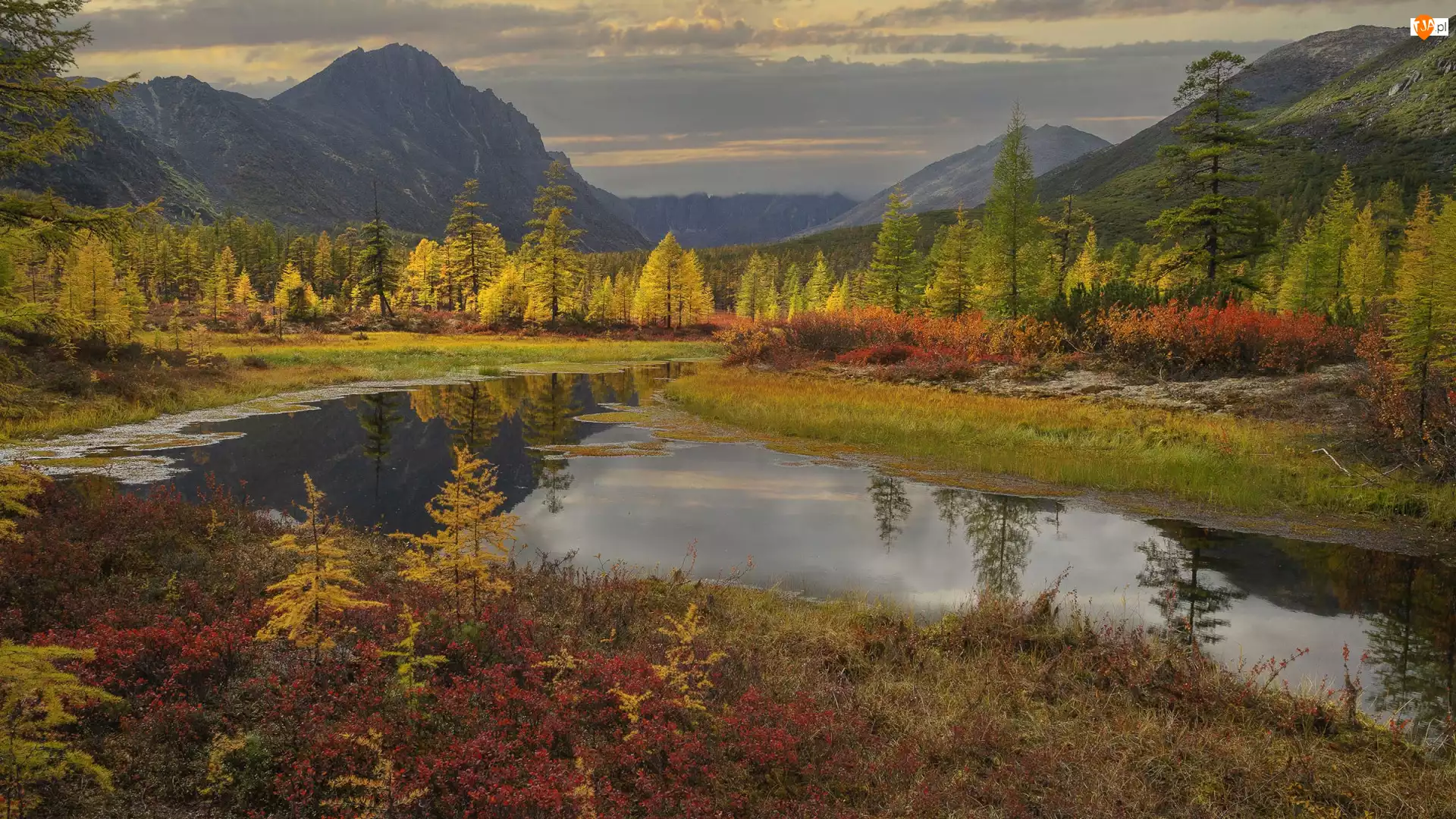 Rosja, Krzewy, Strumień, Kolorowe, Góry, Jesień, Pożółkłe, Las, Drzewa, Kołyma
