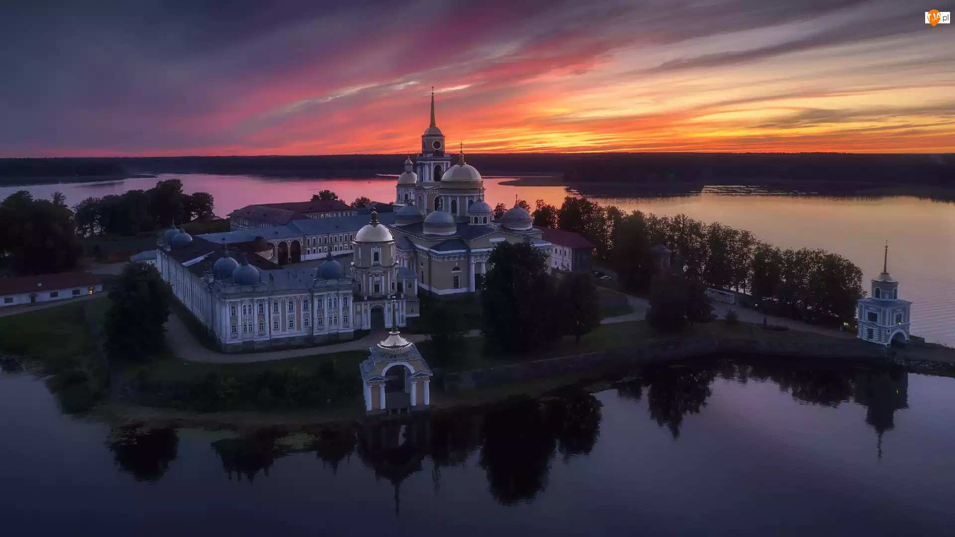 Rosja, Stolobny, Słońca, Drzewa, Zachód, Jezioro Seliger, Klasztor, Wyspa, Pustelnia Niłowo-Stołobieńska