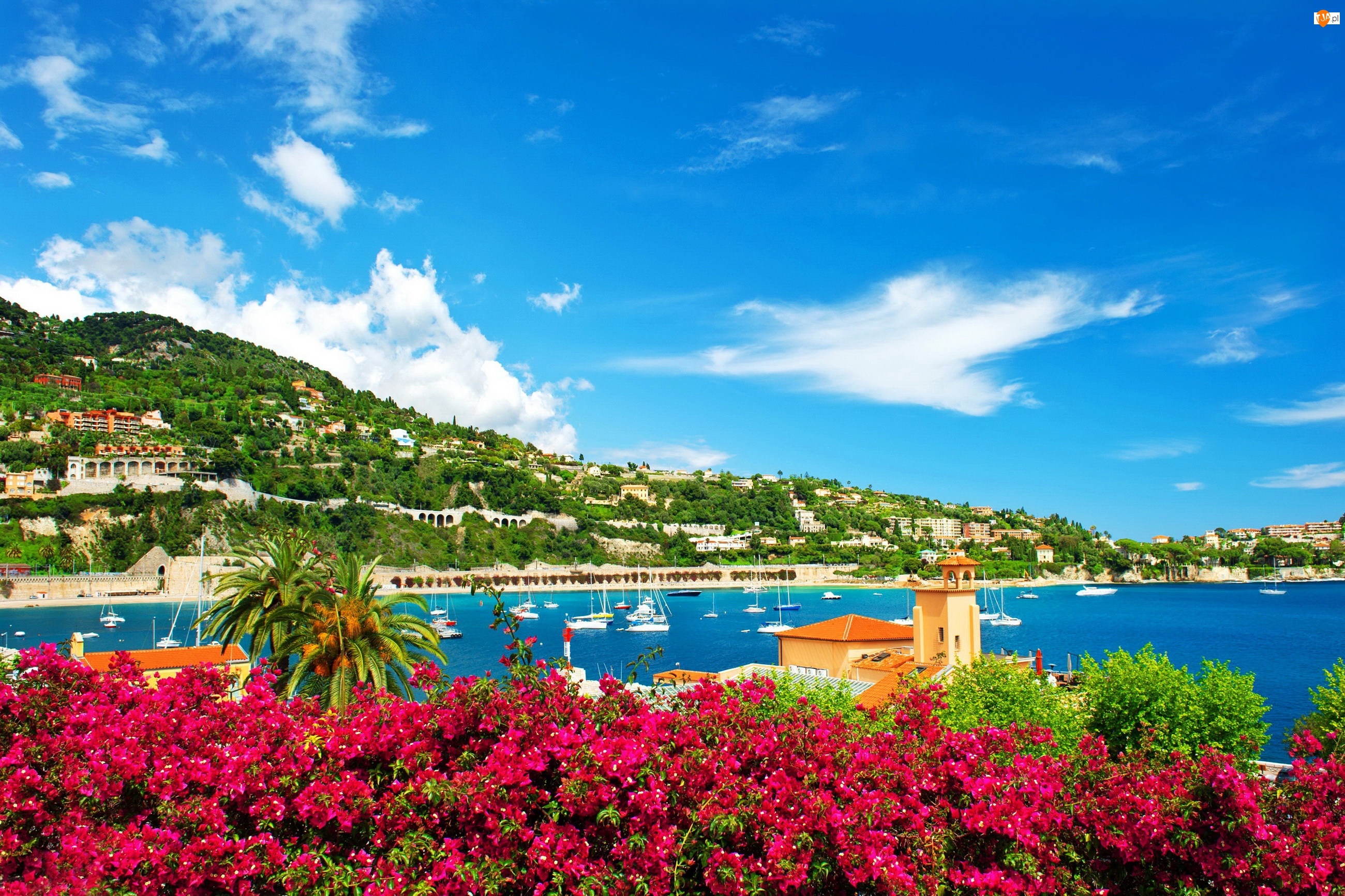 Roślinność, Statki, Wzgórze, Kwiaty, Morze, Budynki