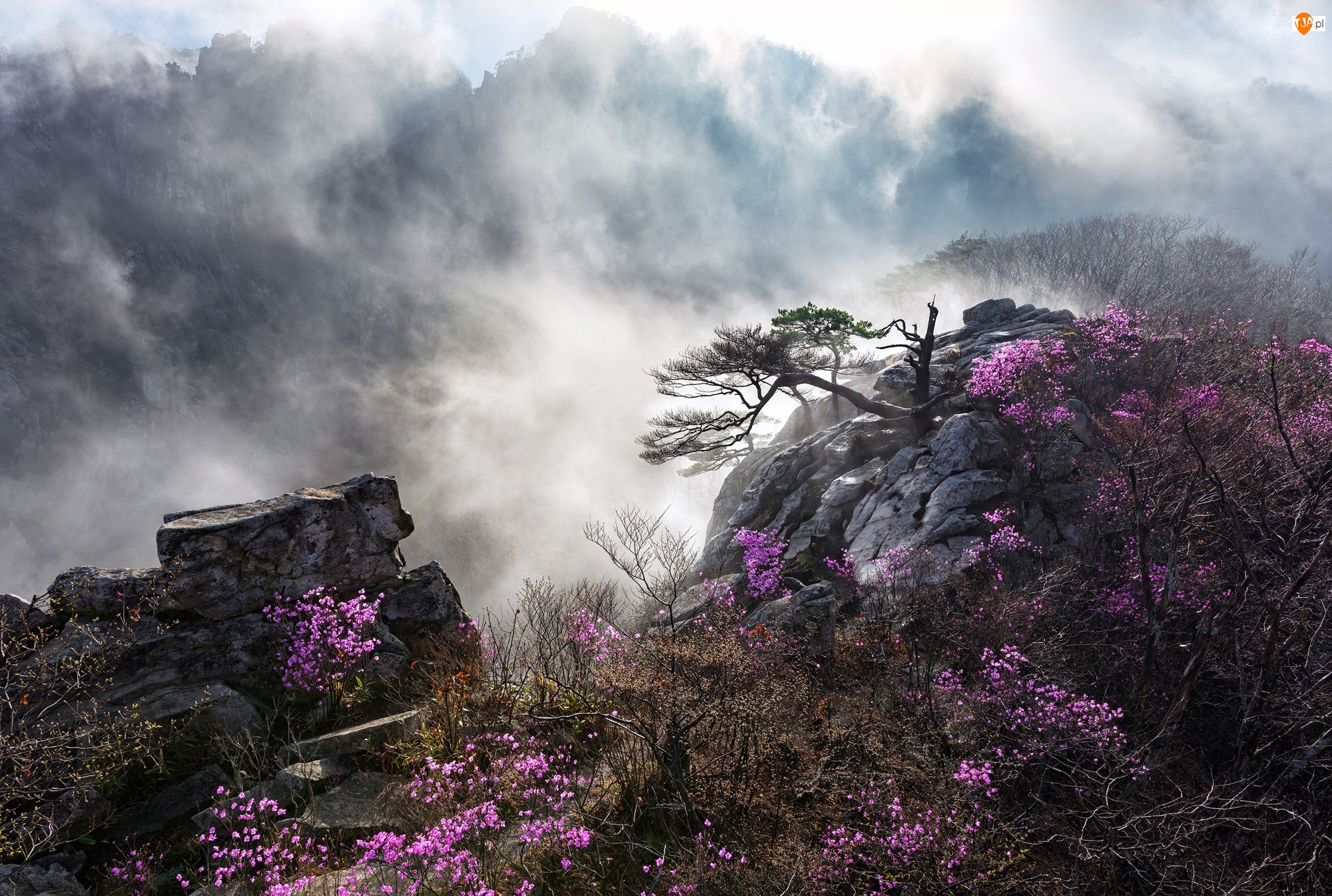 Krzewy, Góry, Roślinność, Kwiaty, Skały, Drzewo, Mgła, Szczyt