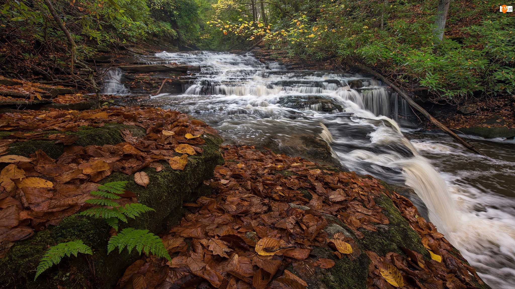 Wodospad, Kaskada, Rośliny, Rzeka, Paproć, Liście, Las