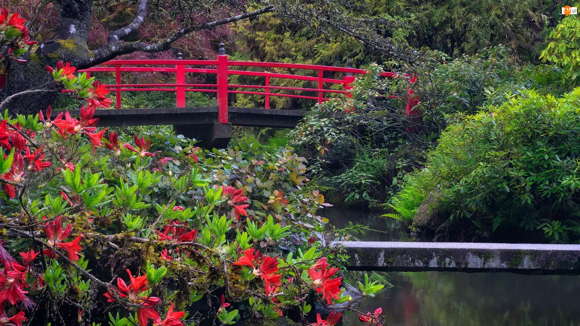 Stany Zjednoczone, Czerwony, Stan Waszyngton, Kubota Garden, Seattle, Mostek, Krzew, Ogród, Różanecznik