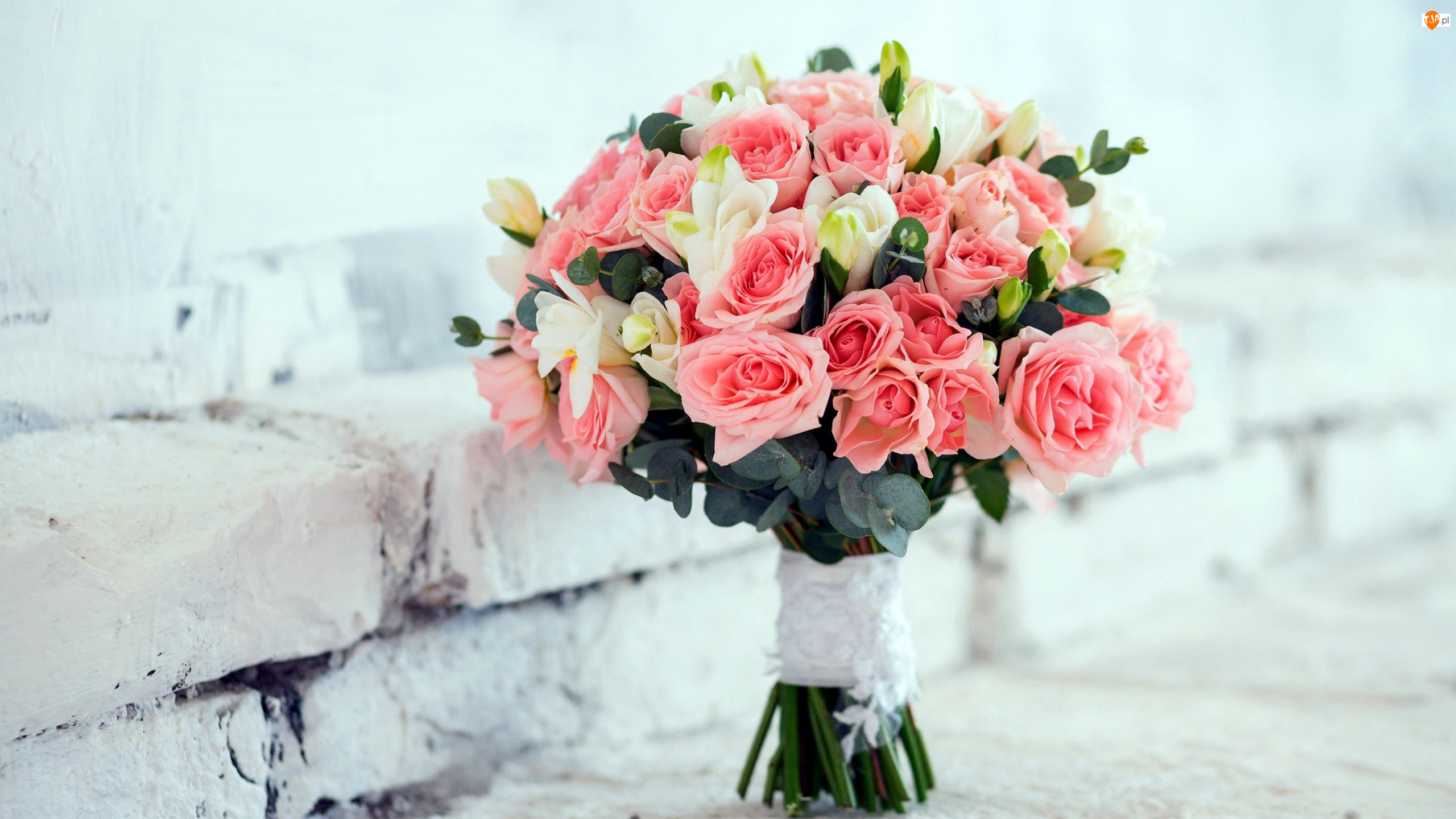 Bukiet, Kwiaty, Róże, Frezje, Różowe, Białe
