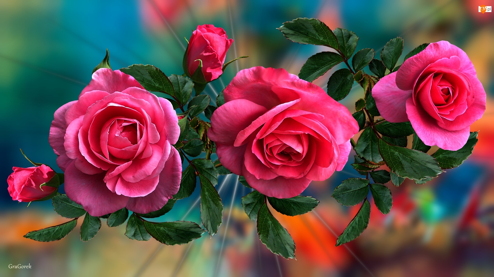 Róże, Grafika 2D, Trzy, Kwiaty, Liście