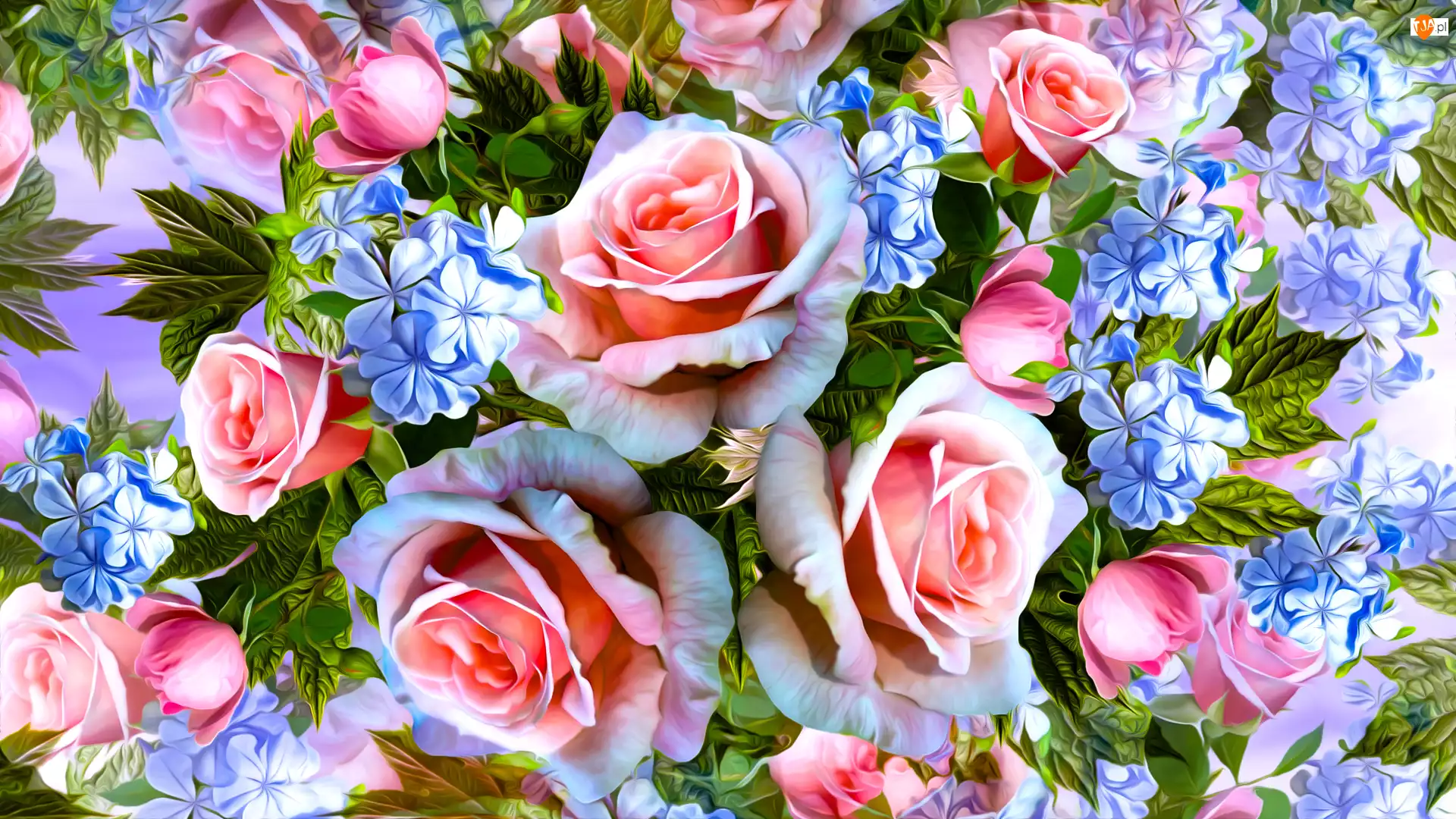 Różowe, Kwiaty, Niebieskie, Grafika, Róże, Kwiatki