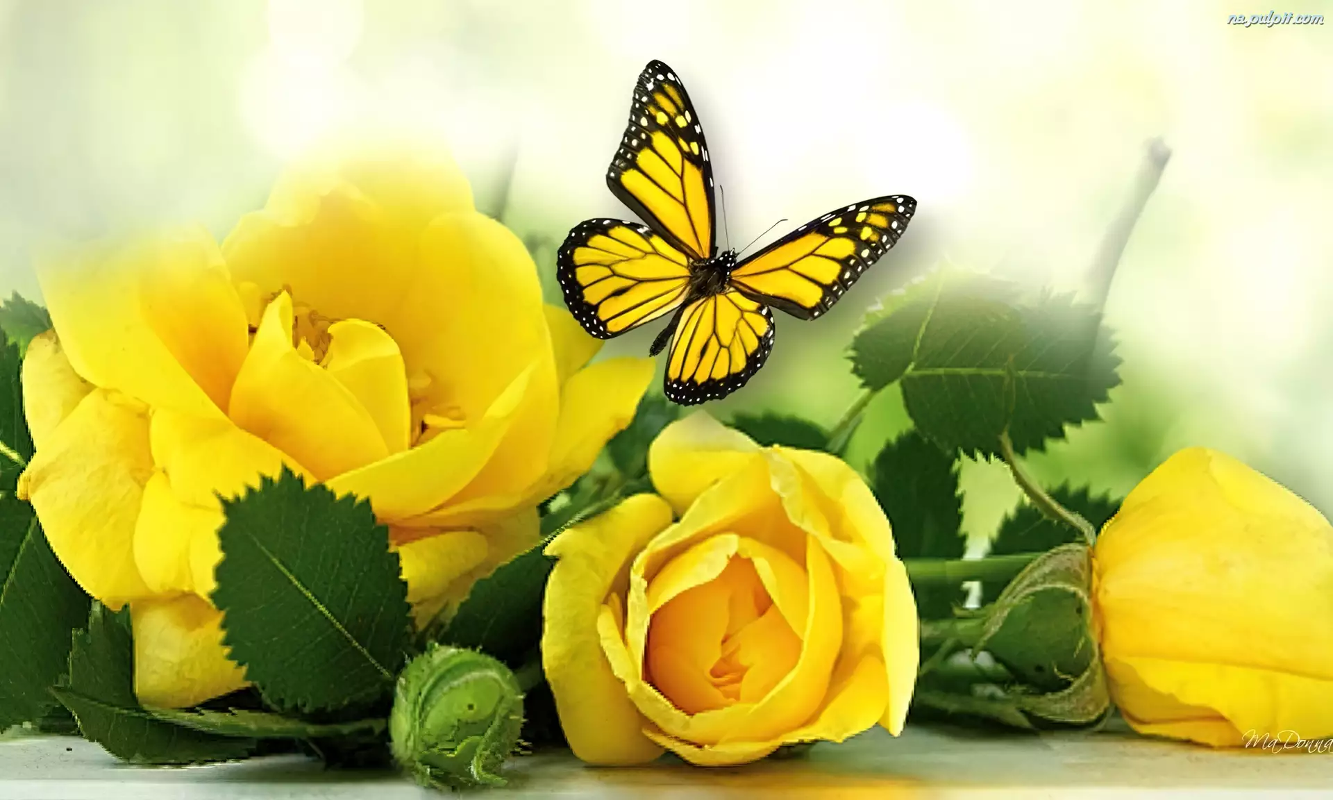 Róże, Motyl, Żółte, Liście