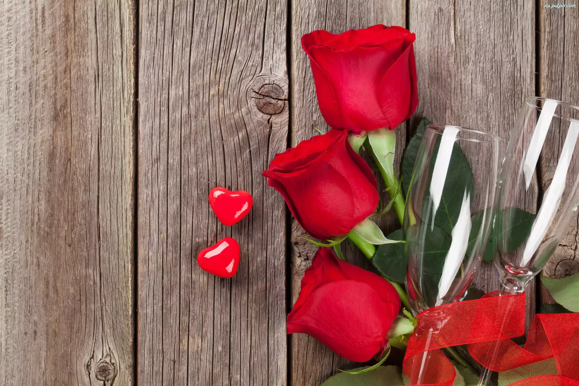 Dwa, Serca, Róże, Walentynki, Czerwone, Kieliszki, Dwa