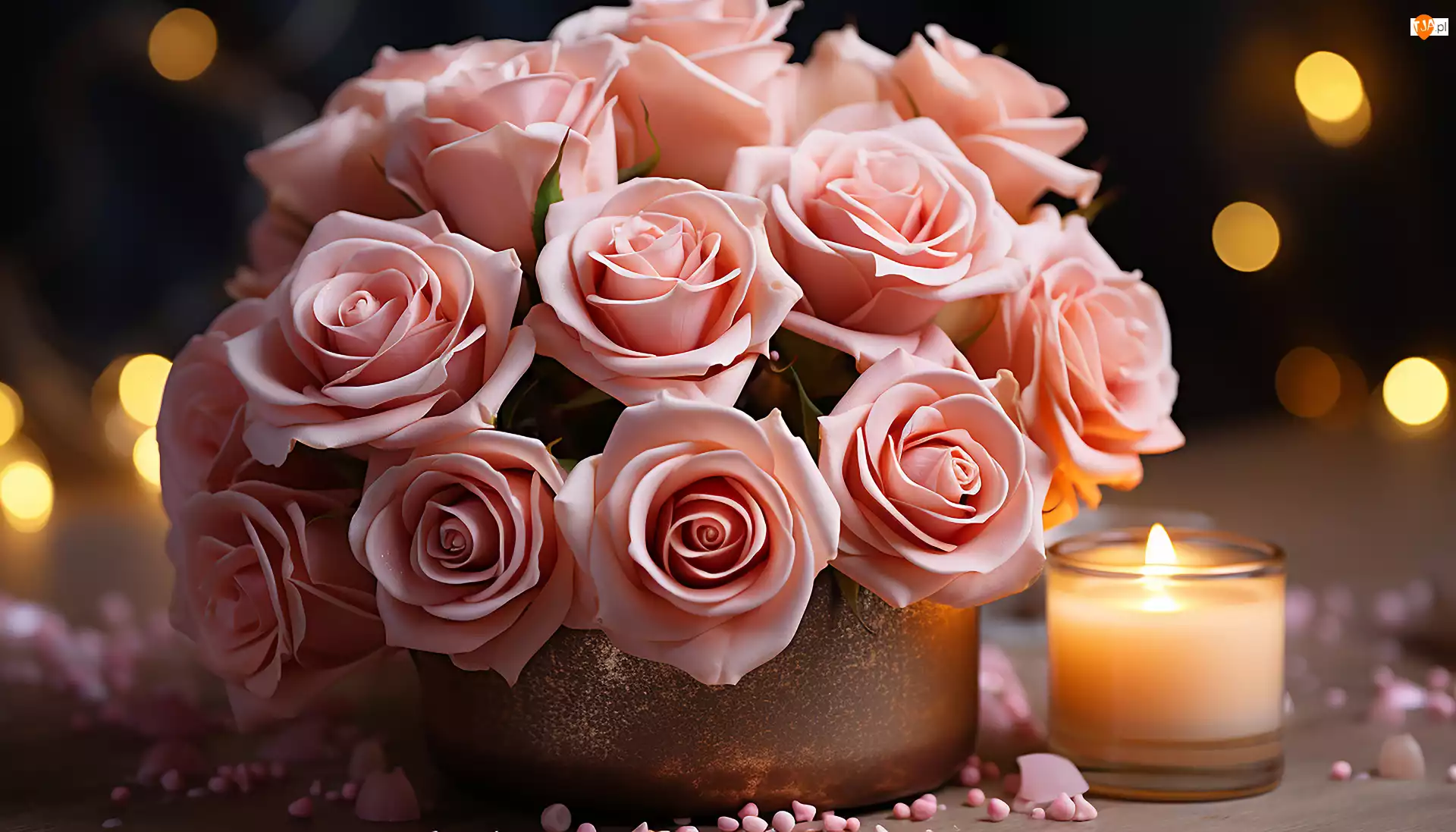 Róże, Świeczka, Różowe, Bukiet, Wazon